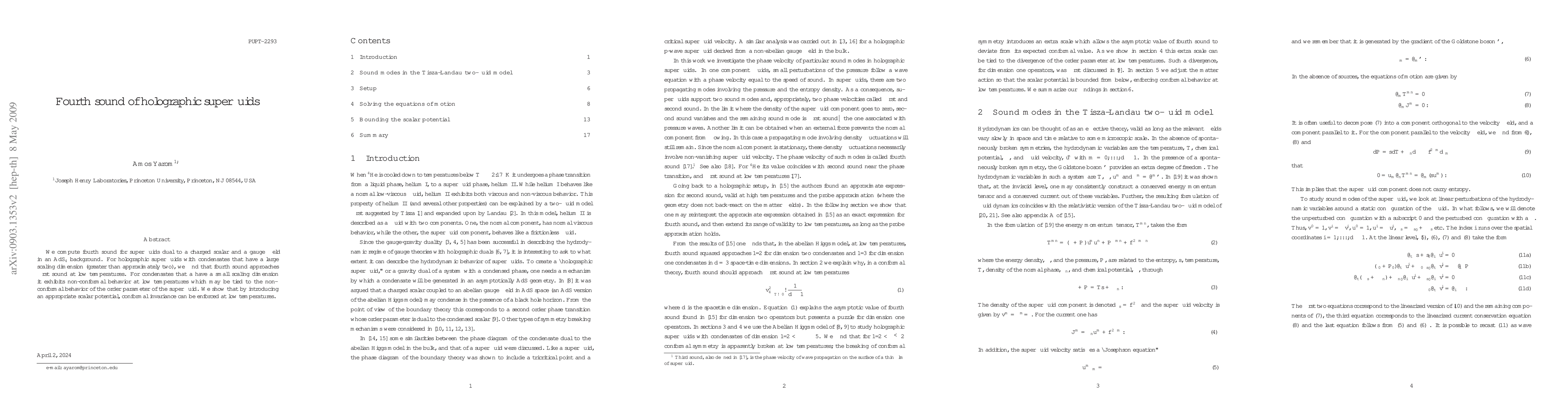This paper investigates fourth sound in holographic superfluids, finding that it behaves similarly to first sound at low temperatures for condensates with large scaling dimensions. For condensates with small scaling dimensions, it shows non-conformal behavior, which can be rectified by introducing a suitable scalar potential to enforce conformal invariance.