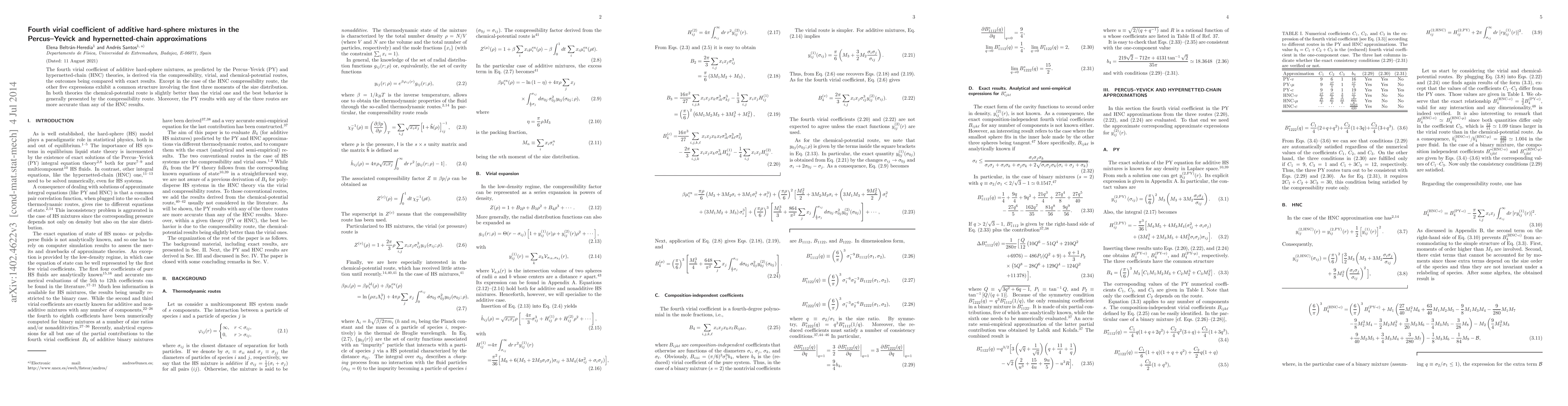 This paper derives the fourth virial coefficient for additive hard-sphere mixtures using Percus-Yevick and hypernetted-chain theories through compressibility, virial, and chemical-potential routes. The results show that the Percus-Yevick method generally provides more accurate predictions than the hypernetted-chain method, with the compressibility route being the most effective.