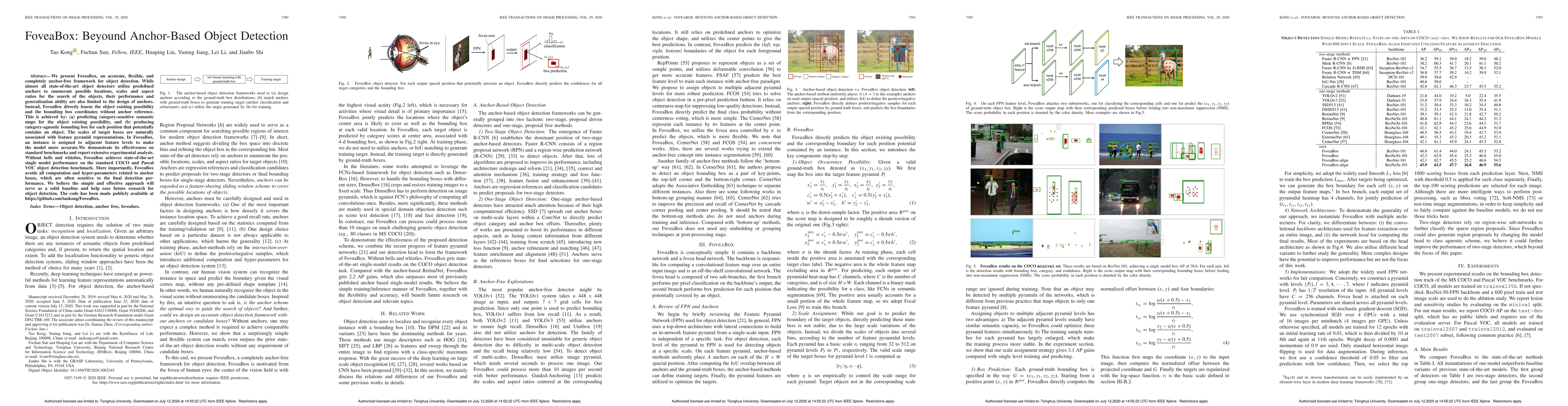 FoveaBox is an innovative, anchor-free framework for object detection that directly learns object existence and bounding box coordinates without predefined anchors. It achieves state-of-the-art performance on COCO and Pascal VOC benchmarks by predicting semantic maps and generating category-agnostic bounding boxes, thus eliminating the need for anchor-related computations and hyperparameters.