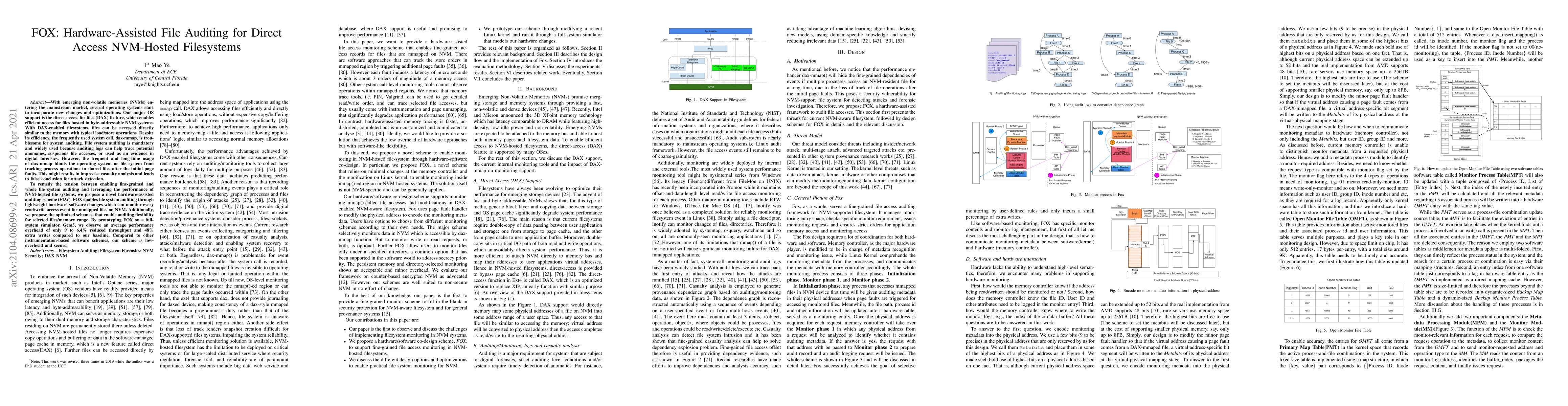 Title: FOX: Hardware-Assisted File Auditing for Direct Access NVM-Hosted Filesystems Summary: This paper proposes FOX, a hardware-assisted auditing scheme to enhance file system auditing for direct access NVM-hosted filesystems, balancing performance and security with minimal overhead and precise anomaly detection.