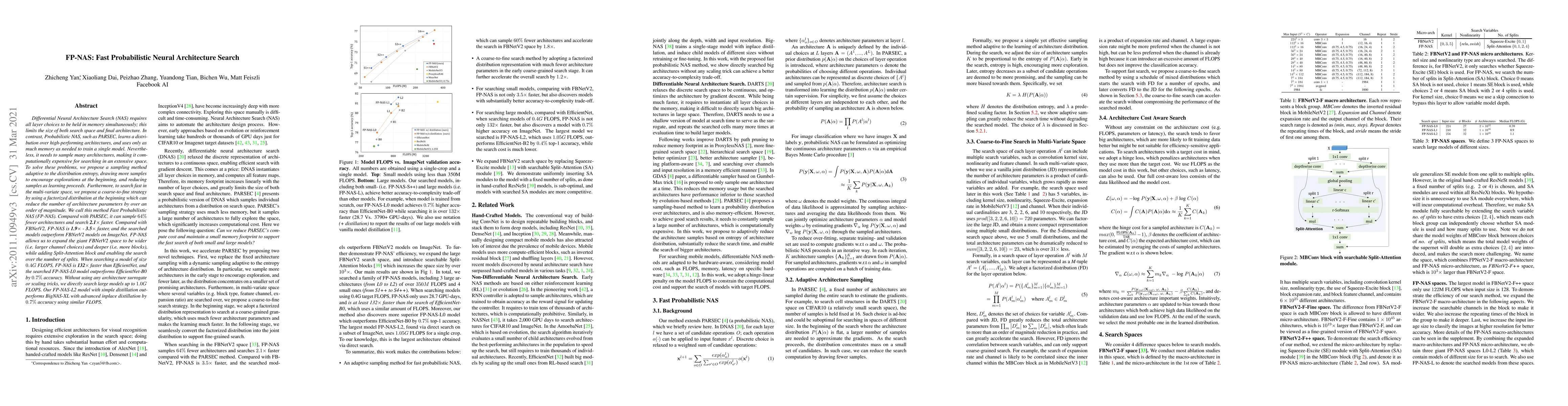 FP-NAS proposes a fast probabilistic neural architecture search method that reduces memory usage and computational cost by adaptively sampling from the distribution of high-performing architectures and employing a coarse-to-fine strategy. This approach searches larger and deeper models efficiently, outperforming existing methods on ImageNet and scaling to 1.0G FLOPS.