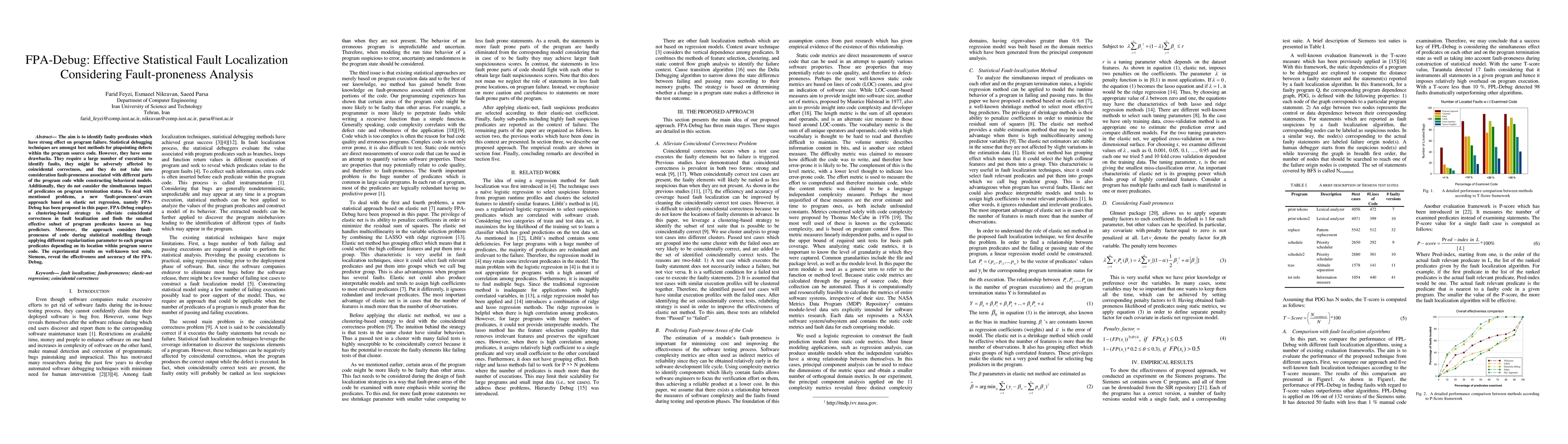 FPA-Debug proposes a novel statistical fault localization method using elastic net regression to identify faulty predicates, addressing issues like large execution requirements and coincidental correctness by incorporating fault-proneness analysis and clustering strategies. Experimental results show its effectiveness in accurately pinpointing defects.