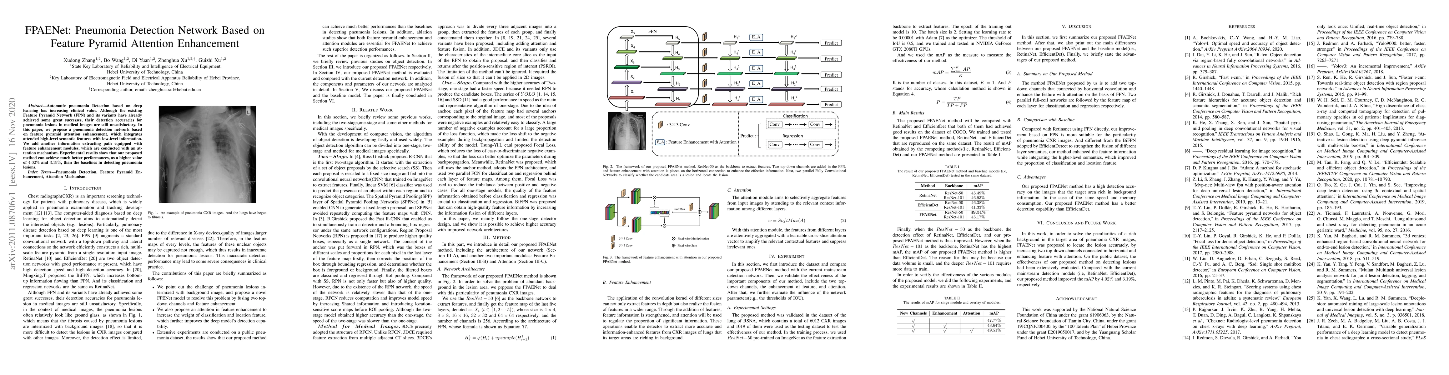The paper proposes FPAENet, a pneumonia detection network that enhances feature pyramid networks with an attention mechanism to integrate high-level semantic features with low-level information. Experimental results demonstrate significant improvements over baselines, achieving a 4.02% and 3.19% higher accuracy in detecting pneumonia lesions.