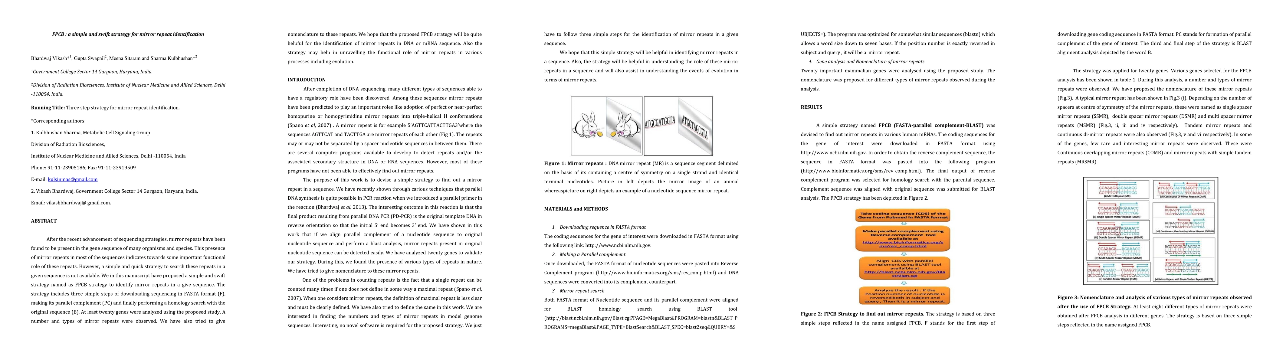 After the recent advancement of sequencing strategies, mirror repeats have been found to be present in the gene sequence of many organisms and species. This presence of mirror repeats in most of the sequences indicates towards some important functional role of these repeats. However, a simple and quick strategy to search these repeats in a given sequence is not available. We in this manuscript have proposed a simple and swift strategy named as FPCB strategy to identify mirror repeats in a give sequence. The strategy includes three simple steps of downloading sequencing in FASTA format (F), making its parallel complement (PC) and finally performing a homology search with the original sequence (B). At least twenty genes were analyzed using the proposed study. A number and types of mirror repeats were observed. We have also tried to give nomenclature to these repeats. We hope that the proposed FPCB strategy will be quite helpful for the identification of mirror repeats in DNA or mRNA sequence. Also the strategy may help in unraveling the functional role of mirror repeats in various processes including evolution.