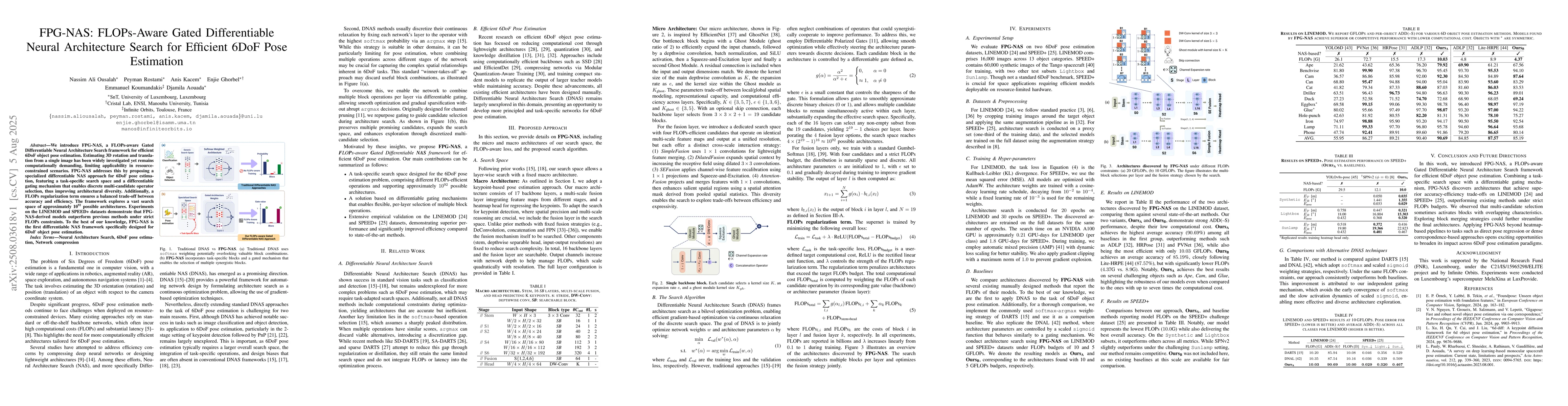 We introduce FPG-NAS, a FLOPs-aware Gated Differentiable Neural Architecture Search framework for efficient 6DoF object pose estimation. Estimating 3D rotation and translation from a single image has been widely investigated yet remains computationally demanding, limiting applicability in resource-constrained scenarios. FPG-NAS addresses this by proposing a specialized differentiable NAS approach for 6DoF pose estimation, featuring a task-specific search space and a differentiable gating mechanism that enables discrete multi-candidate operator selection, thus improving architectural diversity. Additionally, a FLOPs regularization term ensures a balanced trade-off between accuracy and efficiency. The framework explores a vast search space of approximately 10\textsuperscript{92} possible architectures. Experiments on the LINEMOD and SPEED+ datasets demonstrate that FPG-NAS-derived models outperform previous methods under strict FLOPs constraints. To the best of our knowledge, FPG-NAS is the first differentiable NAS framework specifically designed for 6DoF object pose estimation.