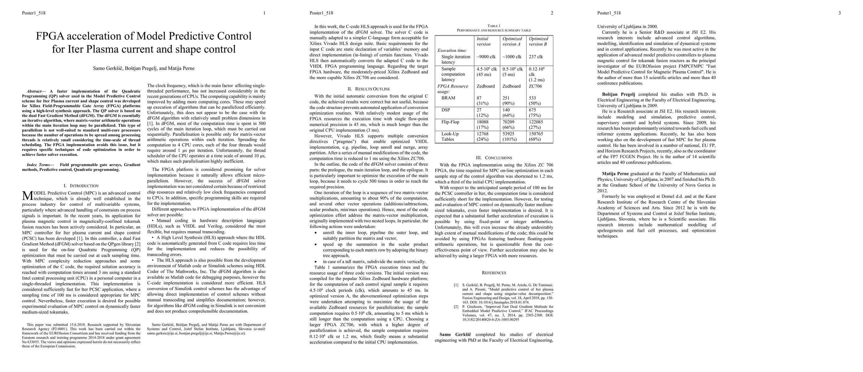 A faster implementation of the Quadratic Programming (QP) solver used in the Model Predictive Control scheme for Iter Plasma current and shape control was developed for Xilinx Field-Programmable Gate Array (FPGA) platforms using a high-level synthesis approach. The QP solver is based on the dual Fast Gradient Method (dFGM). The dFGM is essentially an iterative algorithm, where matrix-vector arithmetic operations within the main iteration loop may be parallelized. This type of parallelism is not well-suited to standard multi-core processors because the number of operations to be spread among processing threads is relatively small considering the time-scale of thread scheduling. The FPGA implementation avoids this issue, but it requires specific techniques of code optimization in order to achieve faster solver execution.