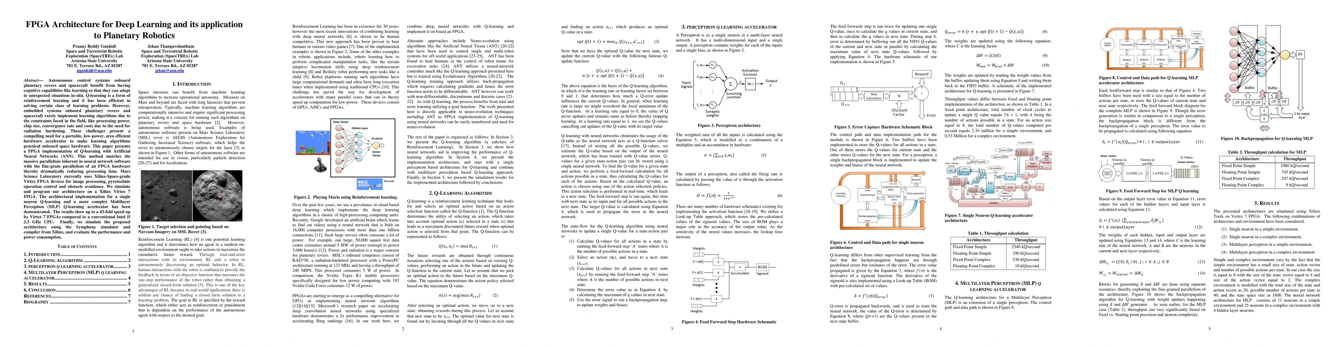 Autonomous control systems onboard planetary rovers and spacecraft benefit from having cognitive capabilities like learning so that they can adapt to unexpected situations in-situ. Q-learning is a form of reinforcement learning and it has been efficient in solving certain class of learning problems. However, embedded systems onboard planetary rovers and spacecraft rarely implement learning algorithms due to the constraints faced in the field, like processing power, chip size, convergence rate and costs due to the need for radiation hardening. These challenges present a compelling need for a portable, low-power, area efficient hardware accelerator to make learning algorithms practical onboard space hardware. This paper presents a FPGA implementation of Q-learning with Artificial Neural Networks (ANN). This method matches the massive parallelism inherent in neural network software with the fine-grain parallelism of an FPGA hardware thereby dramatically reducing processing time. Mars Science Laboratory currently uses Xilinx-Space-grade Virtex FPGA devices for image processing, pyrotechnic operation control and obstacle avoidance. We simulate and program our architecture on a Xilinx Virtex 7 FPGA. The architectural implementation for a single neuron Q-learning and a more complex Multilayer Perception (MLP) Q-learning accelerator has been demonstrated. The results show up to a 43-fold speed up by Virtex 7 FPGAs compared to a conventional Intel i5 2.3 GHz CPU. Finally, we simulate the proposed architecture using the Symphony simulator and compiler from Xilinx, and evaluate the performance and power consumption.
