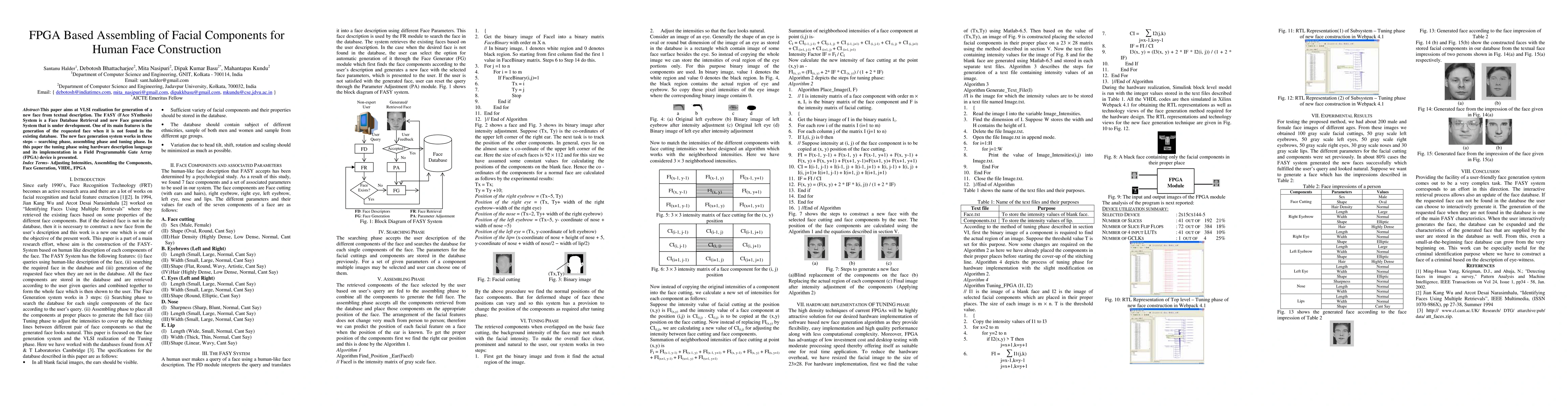 This paper aims at VLSI realization for generation of a new face from textual description. The FASY (FAce SYnthesis) System is a Face Database Retrieval and new Face generation System that is under development. One of its main features is the generation of the requested face when it is not found in the existing database. The new face generation system works in three steps - searching phase, assembling phase and tuning phase. In this paper the tuning phase using hardware description language and its implementation in a Field Programmable Gate Array (FPGA) device is presented.