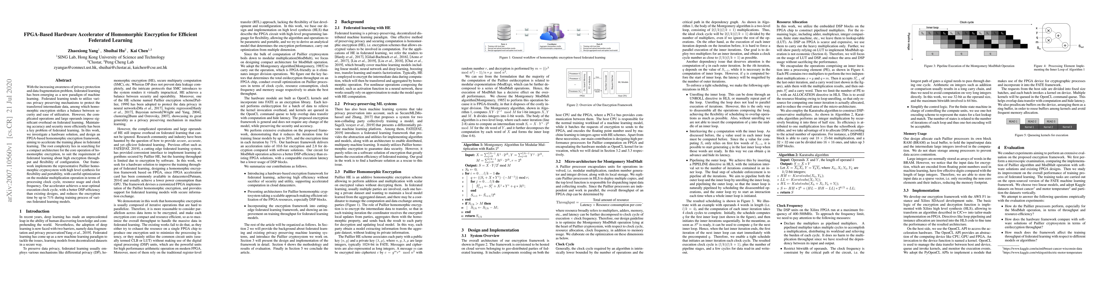 This paper proposes an FPGA-based hardware accelerator for homomorphic encryption to enhance the efficiency of federated learning. The designed framework optimizes the modular multiplication operation, achieving a 71% reduction in encryption time and better DSP efficiency compared to existing designs.