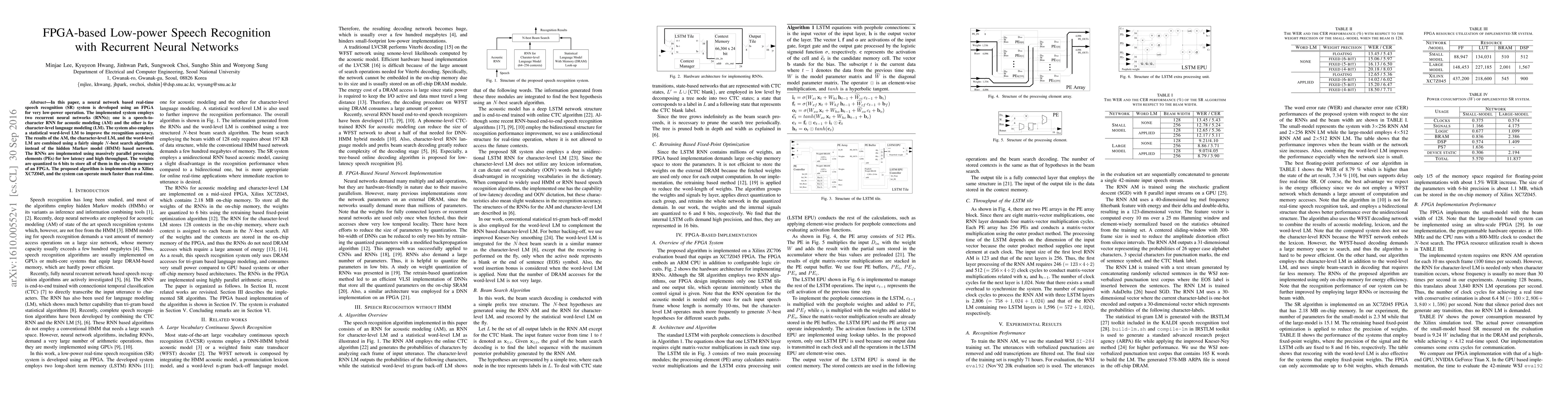 This paper presents an FPGA-based low-power speech recognition system using recurrent neural networks (RNNs) for real-time operation. The system combines acoustic modeling, character-level language modeling, and a statistical word-level language model, achieving faster-than-real-time performance with 6-bit weight quantization.