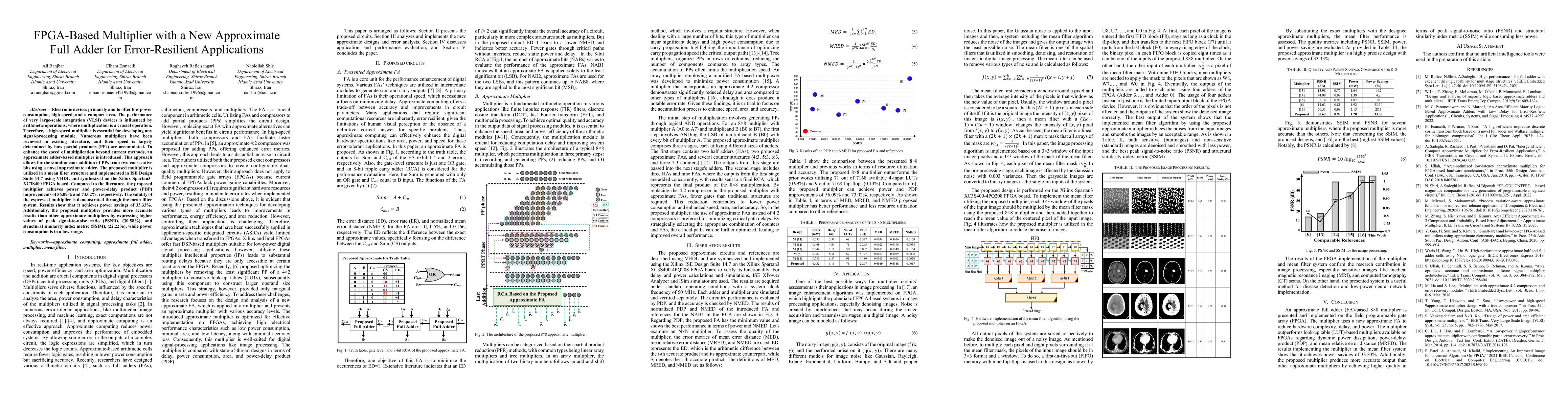 This research introduces an FPGA-based multiplier with a new approximate full adder for error-resilient applications, achieving 56.09% power and 73.02% power-delay product improvements over existing methods.