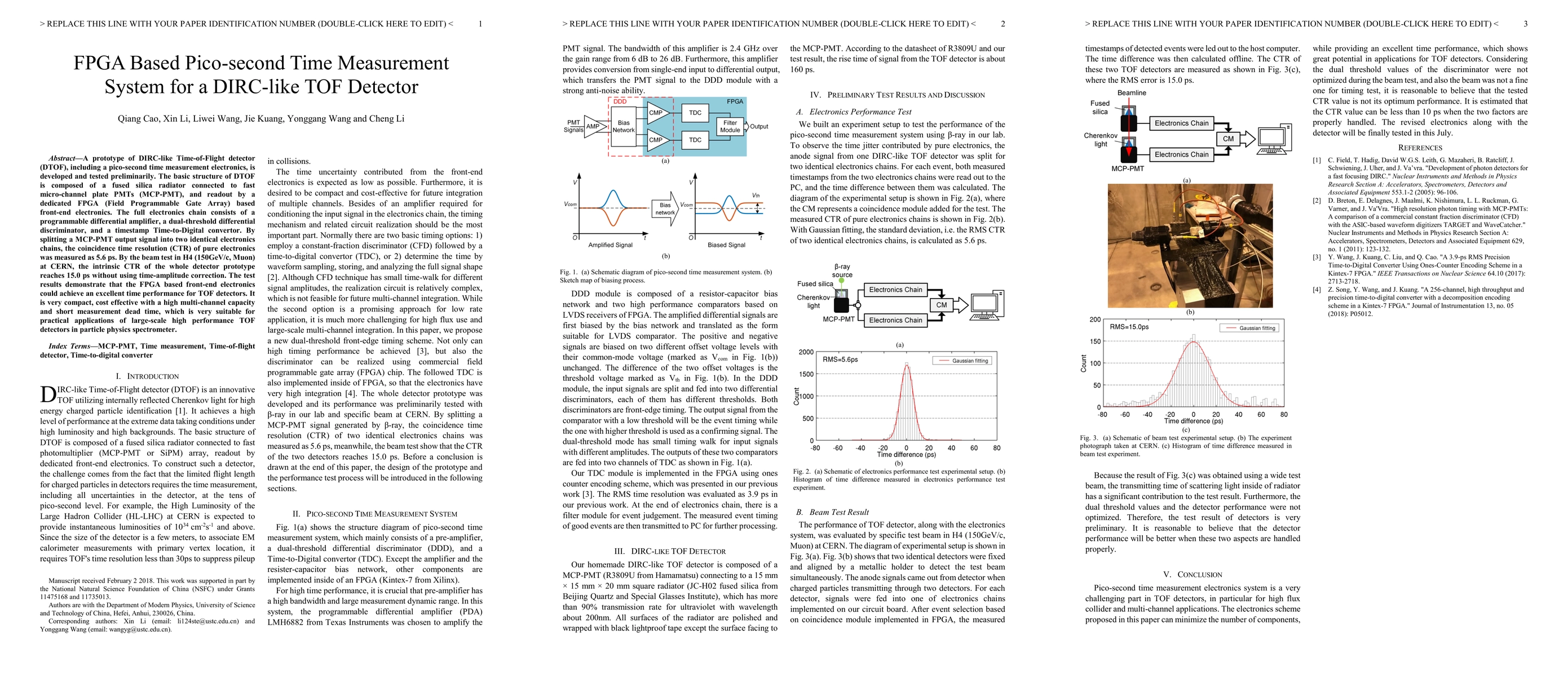 A prototype of a DIRC-like Time-of-Flight detector with pico-second precision was developed, achieving a coincidence time resolution of 15.0 ps. The FPGA-based front-end electronics demonstrated excellent time performance, compactness, cost-effectiveness, and suitability for large-scale high-performance TOF detectors in particle physics.