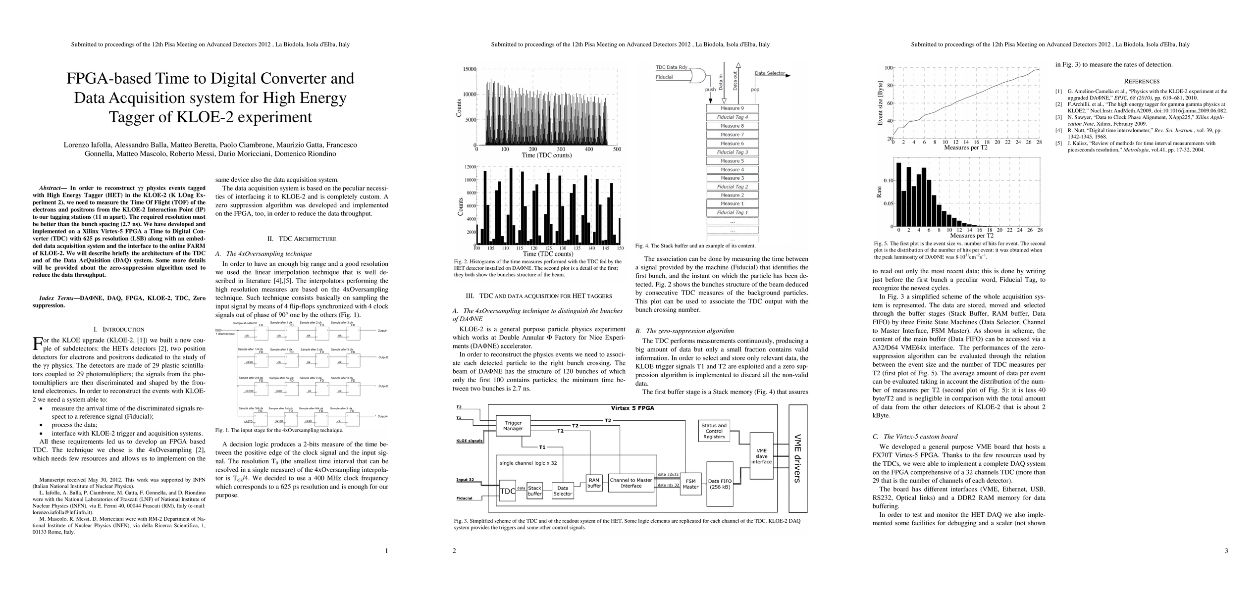 This paper describes the development of an FPGA-based Time to Digital Converter (TDC) and Data Acquisition system for the KLOE-2 experiment's High Energy Tagger, achieving a 625 ps resolution to measure the Time of Flight of electrons and positrons, essential for reconstructing gamma-gamma physics events. The system includes a zero-suppression algorithm to manage data throughput.