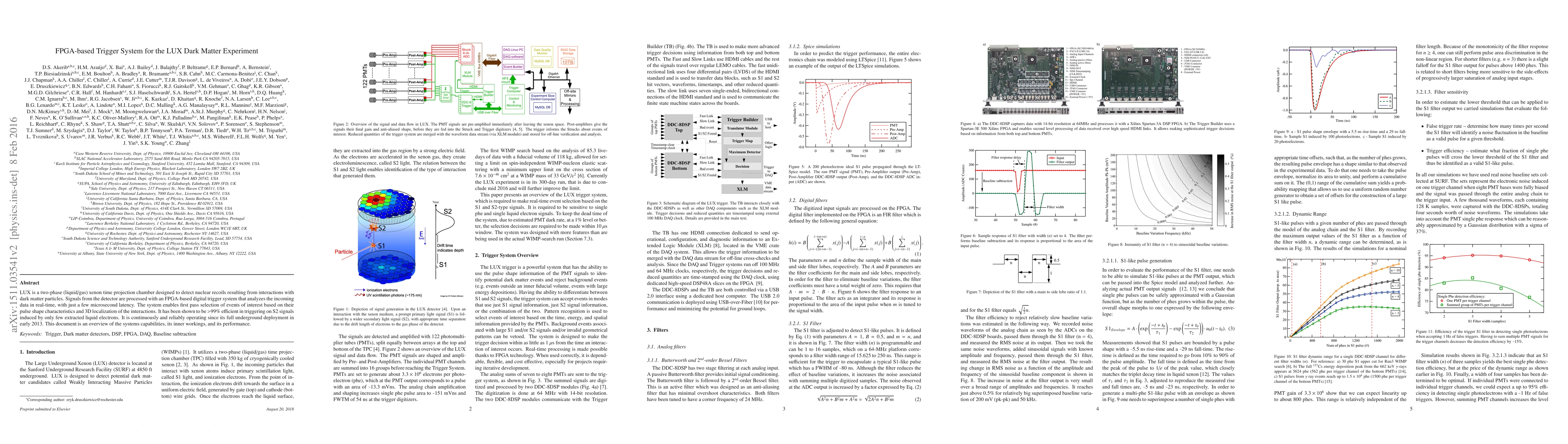 The LUX experiment employs an FPGA-based trigger system to efficiently process signals from its xenon time projection chamber, achieving >99% efficiency in detecting dark matter interactions with minimal latency, and has been operational since 2013. The system analyzes real-time data to select events based on pulse shape and 3D localization.
