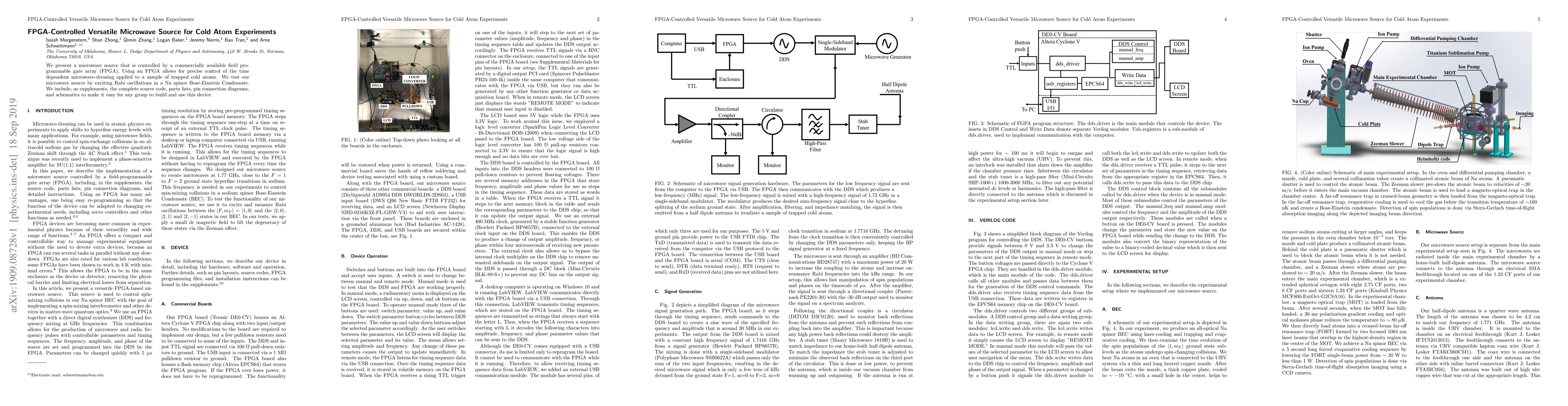 This paper introduces an FPGA-controlled microwave source for precise manipulation of cold atom experiments, demonstrated through Rabi oscillations in a Na spinor Bose-Einstein Condensate. The authors provide detailed supplementary materials to facilitate replication by other research groups.