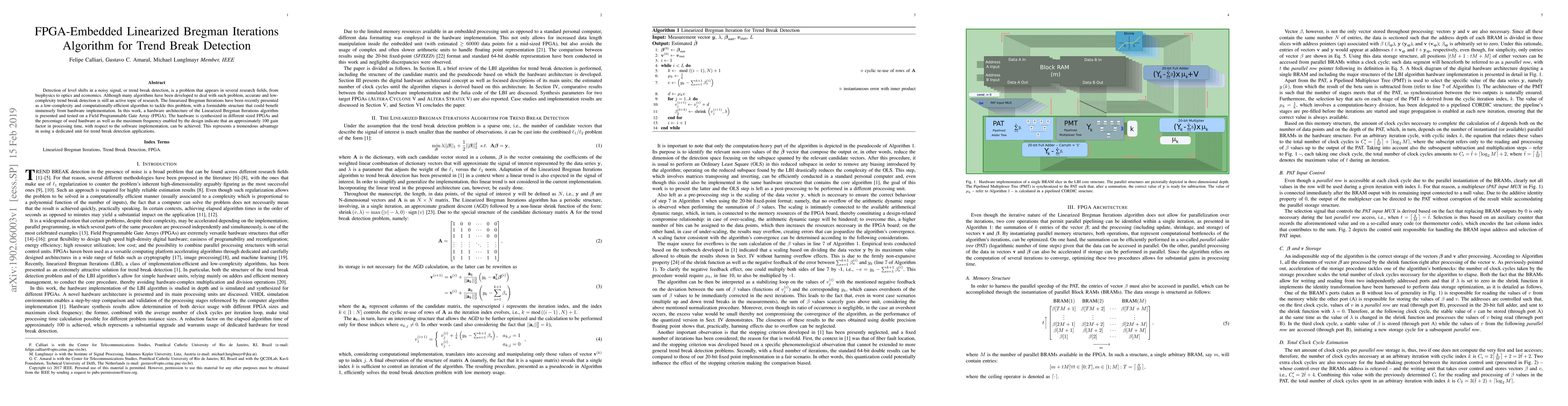 This paper presents a hardware implementation of the Linearized Bregman Iterations algorithm on a Field Programmable Gate Array (FPGA) for trend break detection in noisy signals. The FPGA-based design achieves a significant 100x speedup compared to software implementations, demonstrating the potential of hardware acceleration for this task.