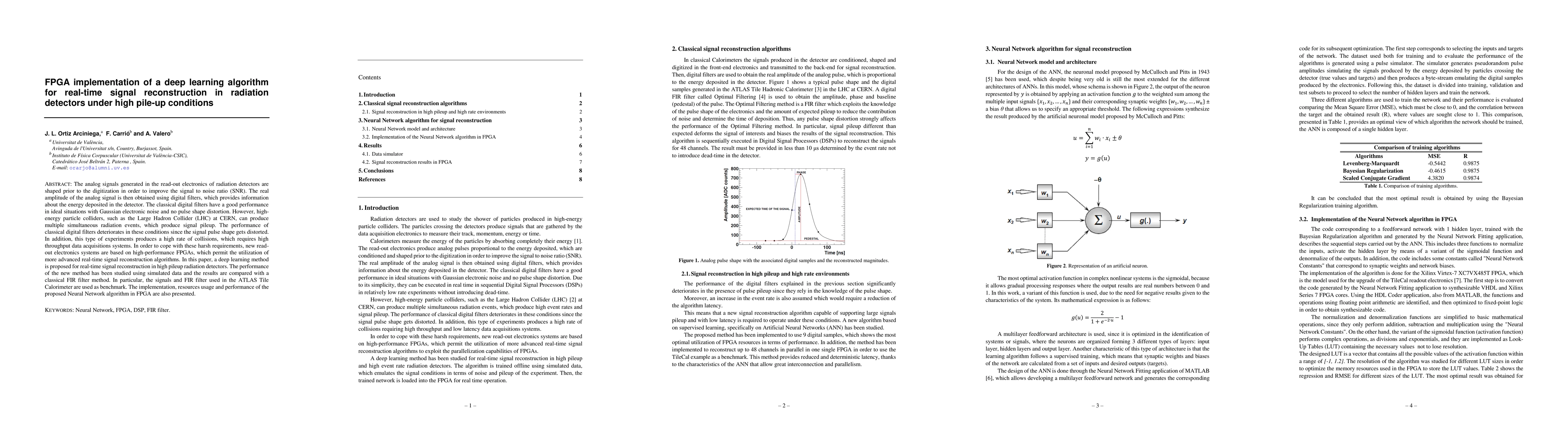 The analog signals generated in the read-out electronics of radiation detectors are shaped prior to the digitization in order to improve the signal to noise ratio (SNR). The real amplitude of the analog signal is then obtained using digital filters, which provides information about the energy deposited in the detector. The classical digital filters have a good performance in ideal situations with Gaussian electronic noise and no pulse shape distortion. However, high-energy particle colliders, such as the Large Hadron Collider (LHC) at CERN, can produce multiple simultaneous radiation events, which produce signal pileup. The performance of classical digital filters deteriorates in these conditions since the signal pulse shape gets distorted. In addition, this type of experiments produces a high rate of collisions, which requires high throughput data acquisitions systems. In order to cope with these harsh requirements, new read-out electronics systems are based on high-performance FPGAs, which permit the utilization of more advanced real-time signal reconstruction algorithms. In this paper, a deep learning method is proposed for real-time signal reconstruction in high pileup radiation detectors. The performance of the new method has been studied using simulated data and the results are compared with a classical FIR filter method. In particular, the signals and FIR filter used in the ATLAS Tile Calorimeter are used as benchmark. The implementation, resources usage and performance of the proposed Neural Network algorithm in FPGA are also presented.