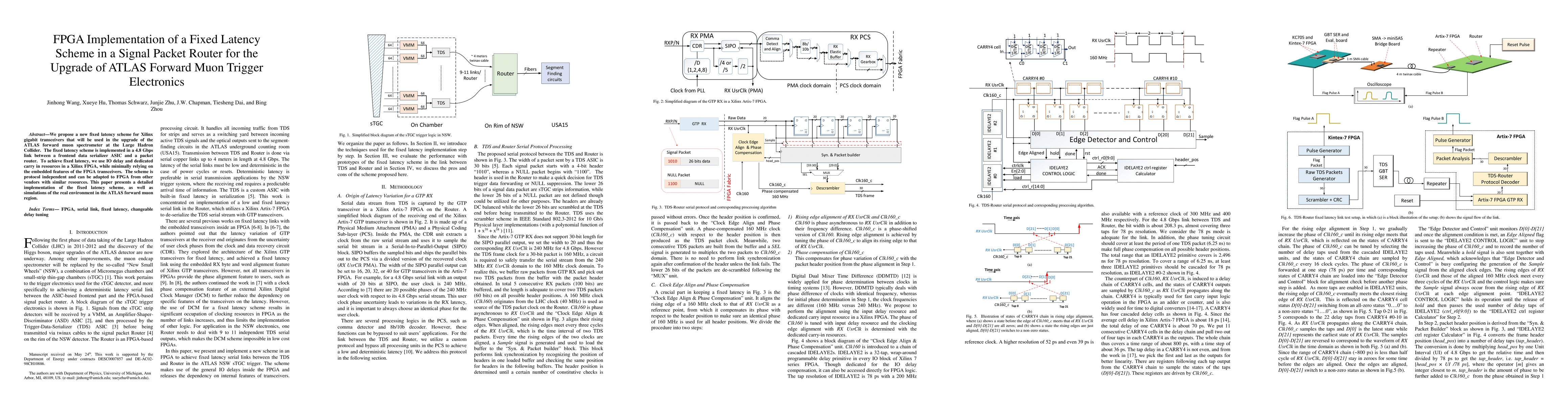 This paper proposes a fixed latency scheme for FPGA-based signal packet routers in the ATLAS forward muon trigger electronics upgrade, implemented in Xilinx gigabit transceivers to ensure consistent latency. The scheme utilizes IO delay and dedicated carry resources in the FPGA, demonstrating protocol independence and adaptability to other FPGA vendors.