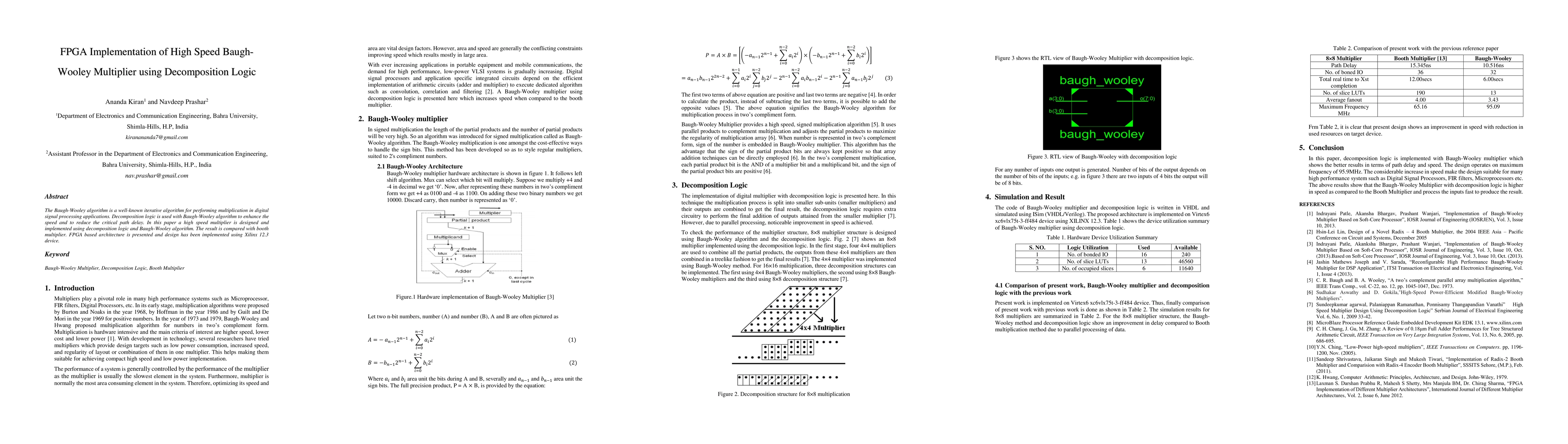 This paper presents a high-speed Baugh-Wooley multiplier implemented on an FPGA using decomposition logic to enhance speed and reduce critical path delay, compared to a Booth multiplier, and executed on Xilinx 12.3 device. The design achieves significant performance improvements in digital signal processing applications.