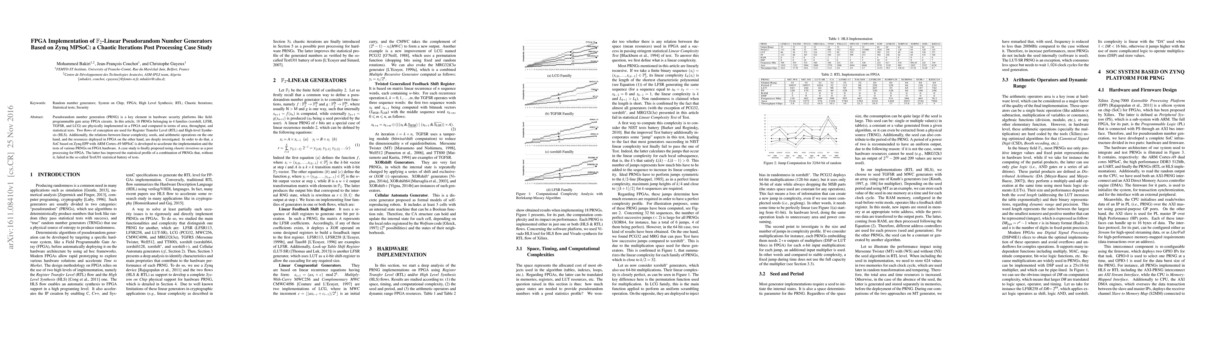This paper presents an FPGA implementation of 18 PRNGs from four families, comparing their area, throughput, and statistical performance. A Zynq MPSoC with ARM Cortex-A9 is used to accelerate testing, and chaotic iterations post-processing improves the statistical profile of certain PRNGs.