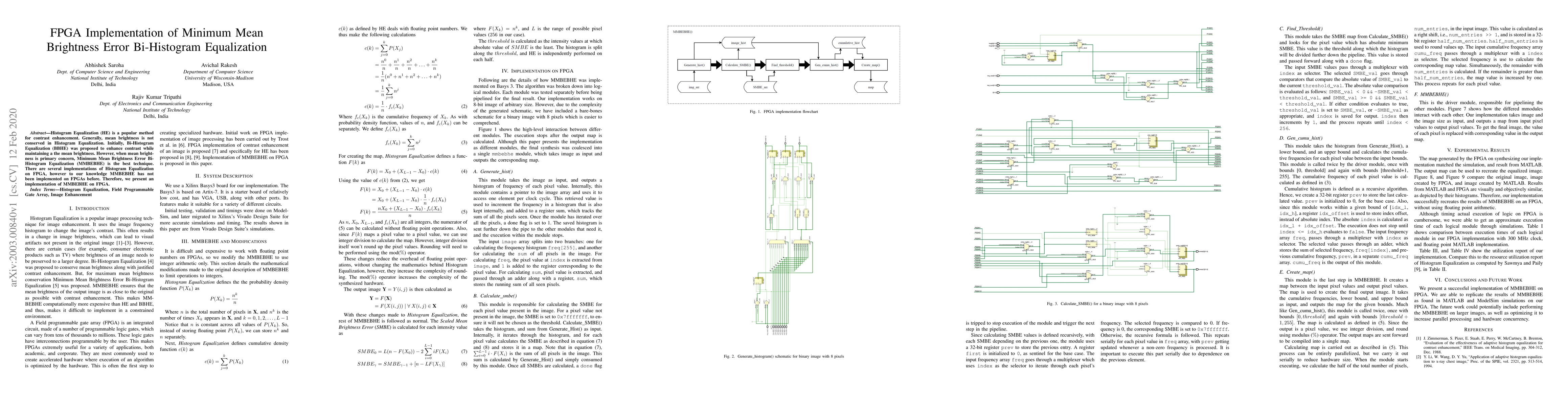 This paper presents the first FPGA implementation of Minimum Mean Brightness Error Bi-Histogram Equalization (MMBEBHE), a technique designed to enhance contrast while preserving mean brightness. The authors aim to address the lack of prior FPGA implementation for this specific method.