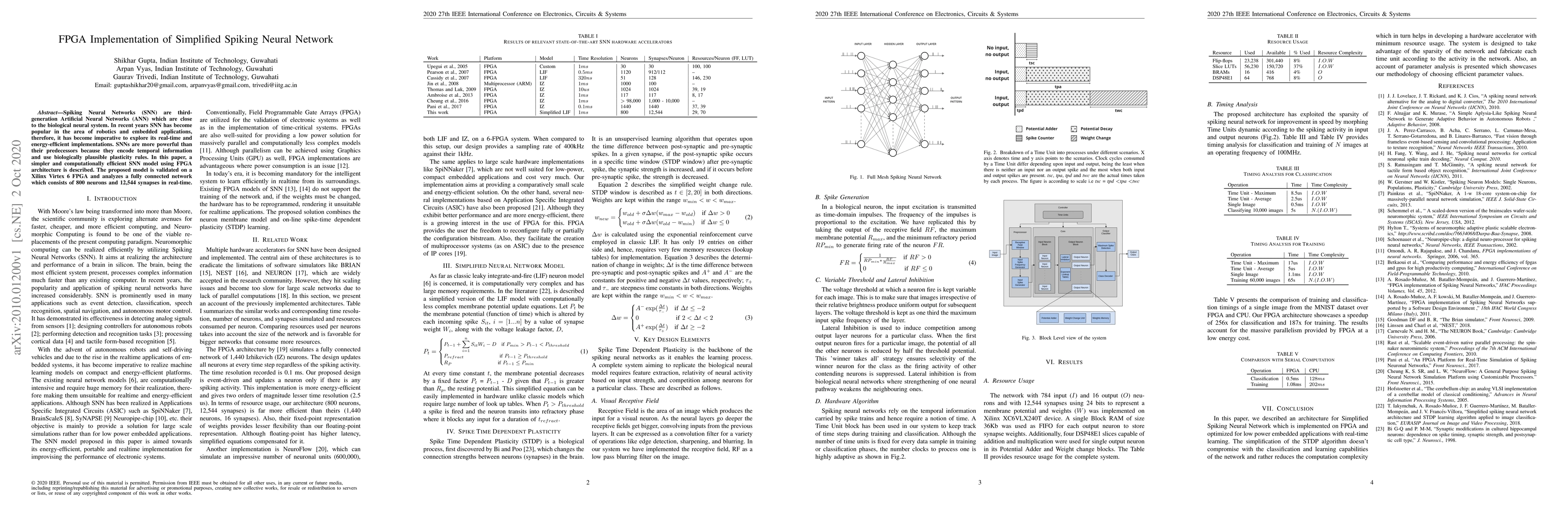 This paper presents a simplified Spiking Neural Network (SNN) implemented on an FPGA for real-time and energy-efficient applications, particularly in robotics and embedded systems. The proposed model, validated on a Xilinx Virtex 6 FPGA, demonstrates a fully connected network with 800 neurons and 12,544 synapses.