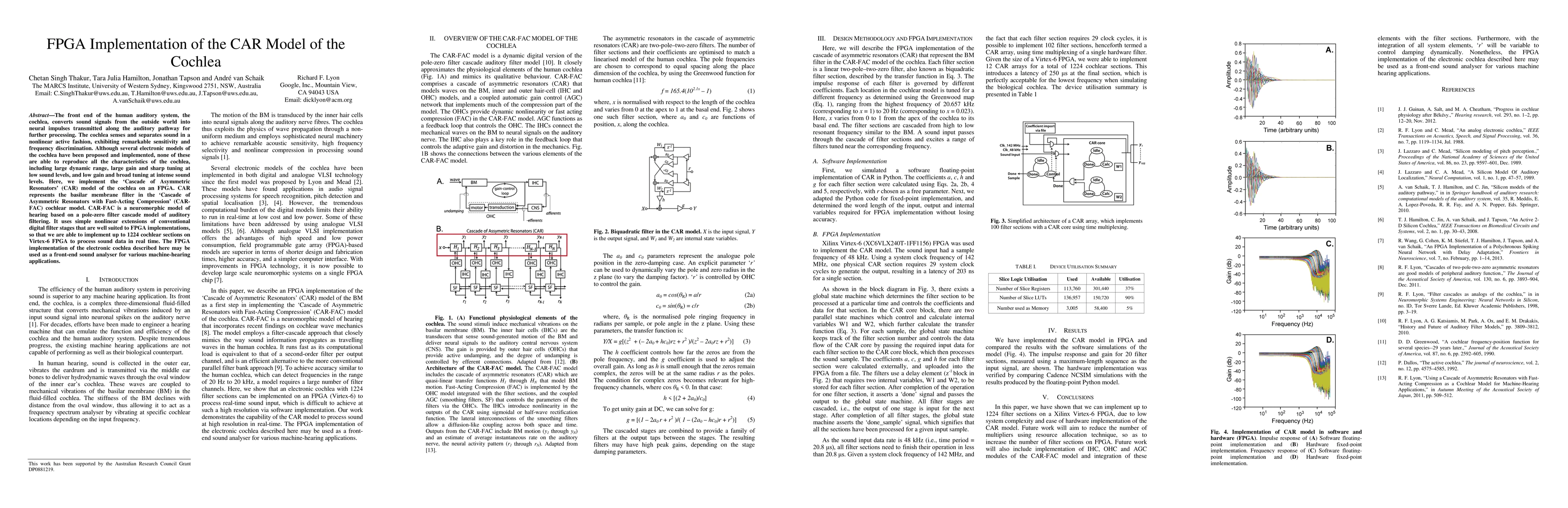 This paper presents an FPGA implementation of the CAR model of the cochlea, aiming to replicate the cochlea's complex auditory filtering characteristics. The Cascade of Asymmetric Resonators (CAR) model, implemented on a Virtex-6 FPGA, processes sound data in real time, potentially serving as a front-end sound analyser for machine-hearing applications.