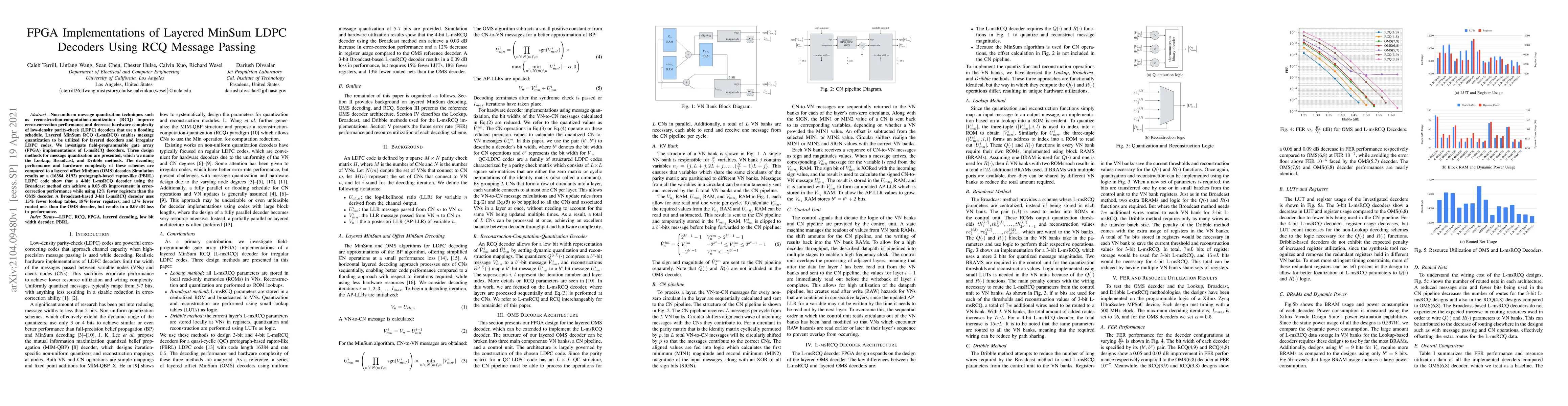 This paper explores FPGA implementations of layered MinSum LDPC decoders using reconstruction-computation-quantization (RCQ) message passing, presenting three quantization methods: Lookup, Broadcast, and Dribble. The Broadcast method achieves a 0.03 dB performance improvement and 12% fewer registers compared to a layered offset MinSum decoder, while the 3-bit variant reduces hardware complexity by 15-18% at the cost of a 0.09 dB performance drop.