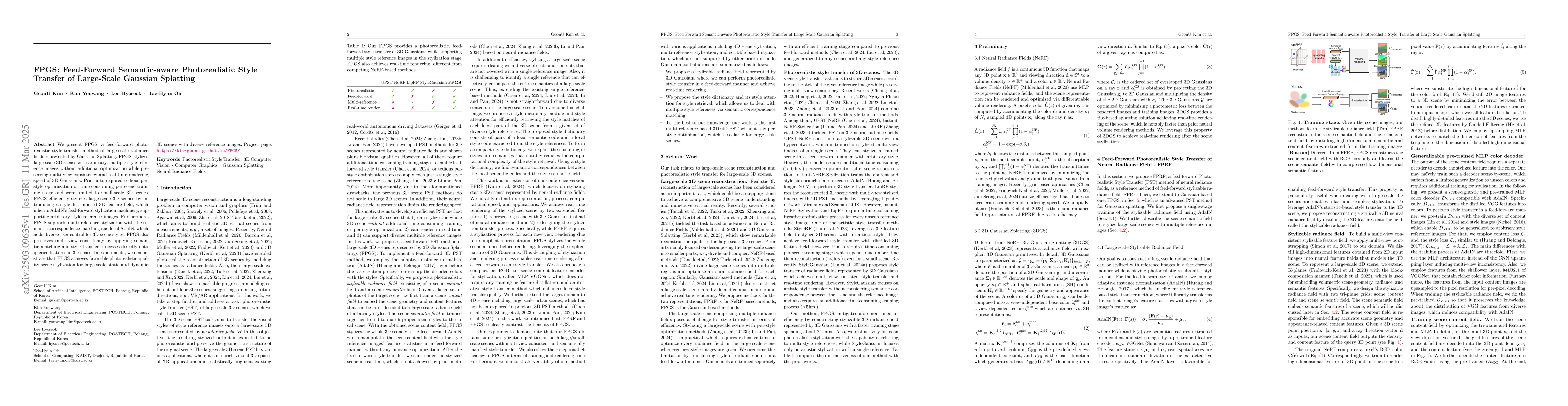FPGS is a feed-forward method for photorealistic style transfer of large-scale Gaussian Splatting radiance fields, enabling real-time stylization of 3D scenes with multiple reference images without additional optimization. FPGS maintains multi-view consistency and supports diverse user-controlled stylization through semantic matching and local AdaIN techniques.