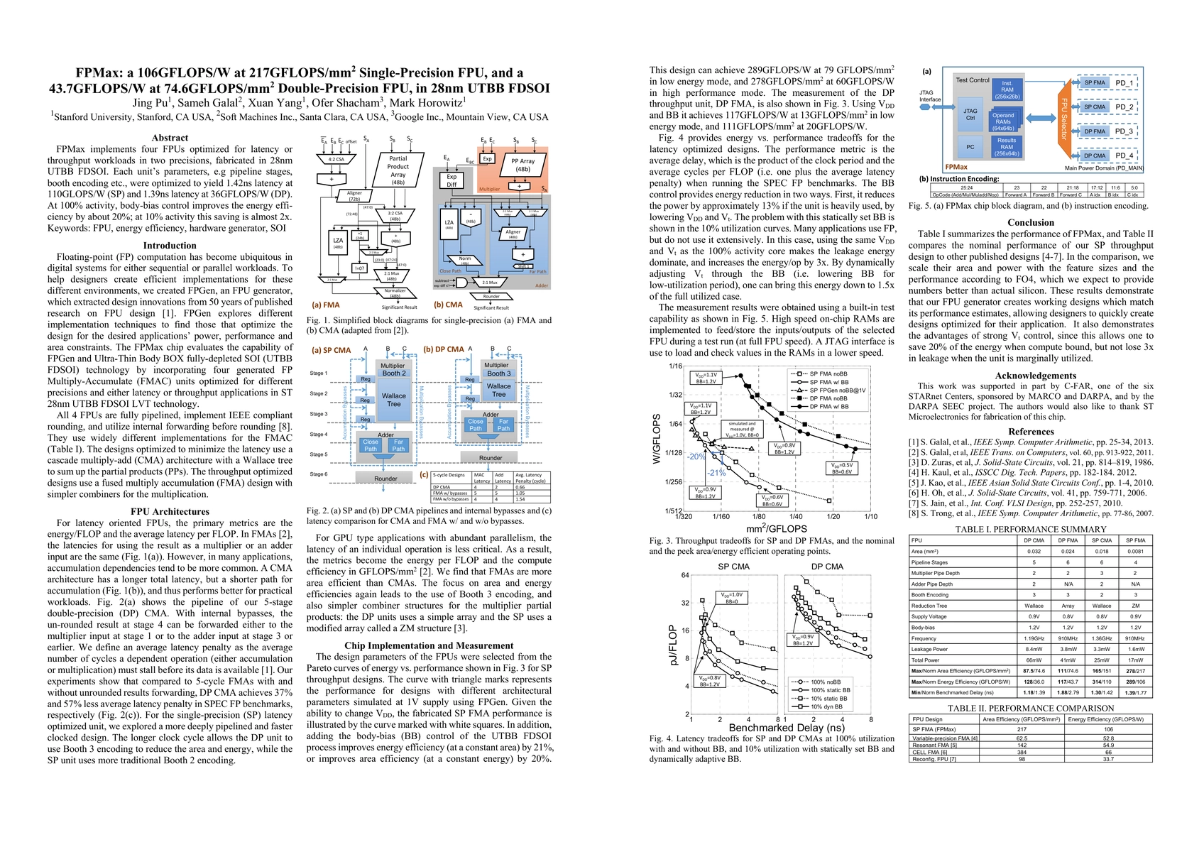 Researchers developed a 106GFLOPS/W single-precision FPU and 43.7GFLOPS/W double-precision FPU with improved energy efficiency in a 28nm process, achieving high performance-to-power ratios.