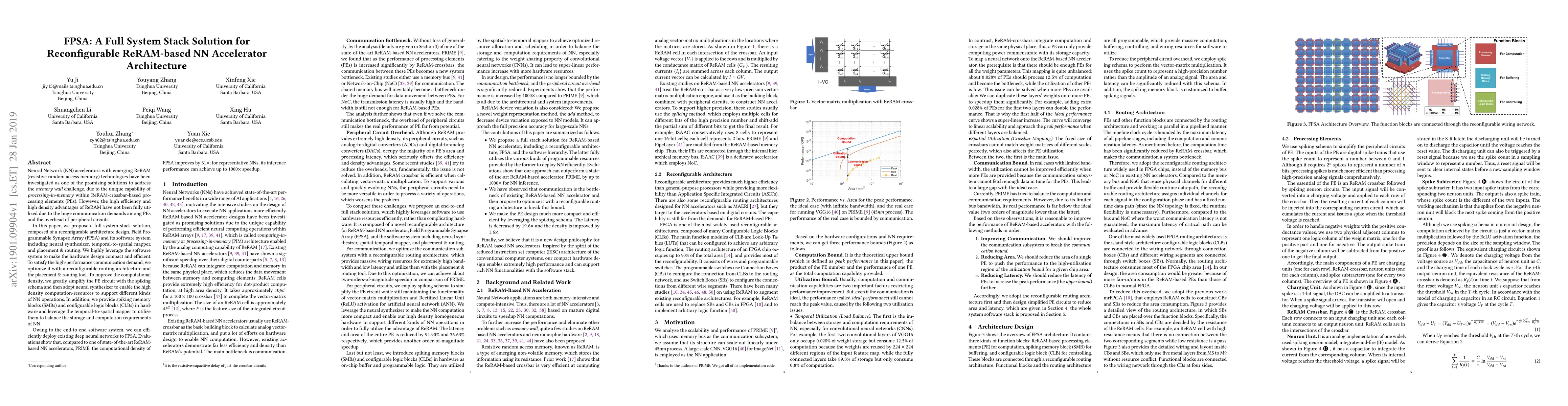 This paper proposes FPSA, a full system stack solution for a reconfigurable ReRAM-based neural network accelerator, aiming to address the memory wall challenge. The solution includes a reconfigurable architecture, a Field Programmable Synapse Array, and an optimized software system to enhance hardware efficiency and computational density. Evaluations show significant improvements in computational density and inference performance compared to existing solutions.
