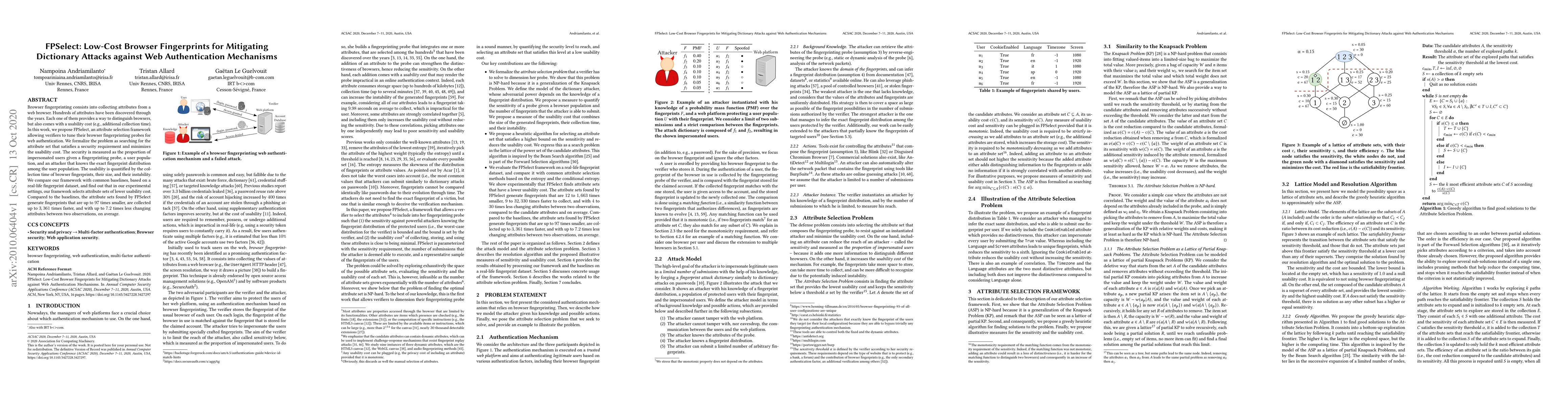 FPSelect is a framework for selecting optimal browser fingerprint attributes to enhance security in web authentication while minimizing usability costs. The study finds that FPSelect-selected fingerprints are significantly smaller, faster to collect, and more stable compared to baseline methods.