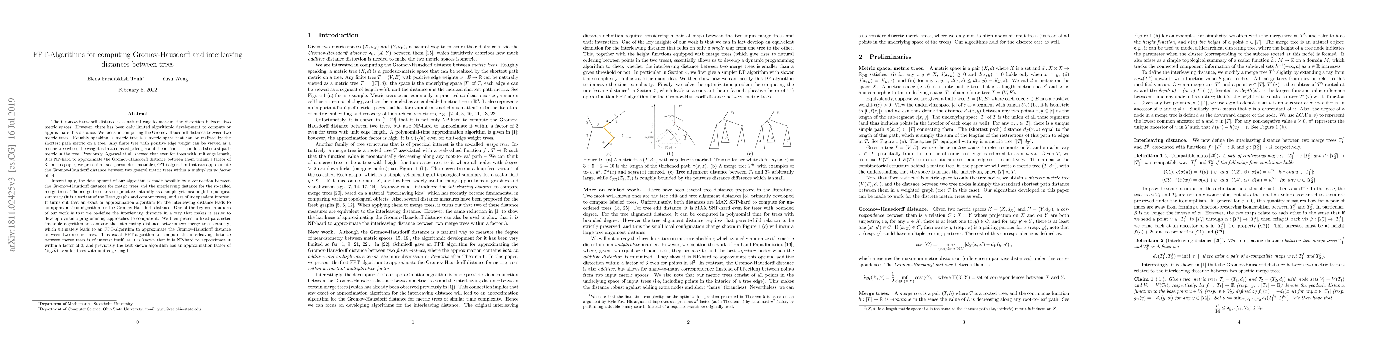 Gromov-Hausdorff (GH) distance is a natural way to measure the distortion between two metric spaces. However, there has been only limited algorithmic development to compute or approximate this distance. We focus on computing the Gromov-Hausdorff distance between two metric trees. Roughly speaking, a metric tree is a metric space that can be realized by the shortest path metric on a tree. Previously, Agarwal et al. showed that even for trees with unit edge length, it is NP hard to approximate the GH distance between them within a factor of 3. In this paper, we present a fixed-parameter tractable (FPT) algorithm that can approximate the GH distance between two general metric trees within a factor of 14. Interestingly, the development of our algorithm is made possible by a connection between the GH distance for metric trees and the interleaving distance for the so-called merge trees. The merge trees arise in practice naturally as a simple yet meaningful topological summary, and are of independent interest. It turns out that an exact or approximation algorithm for the interleaving distance leads to an approximation algorithm for the Gromov-Hausdorff distance. One of the key contributions of our work is that we re-define the interleaving distance in a way that makes it easier to develop dynamic programming approaches to compute it. We then present a FPT algorithm to compute the interleaving distance between two merge trees exactly, which ultimately leads to an FPT-algorithm to approximate the GH distance between two metric trees. This exact FPT-algorithm to compute the interleaving distance between merge trees is of interest itself, as it is known that it is NP-hard to approximate it within a factor of 3, and previously the best known algorithm has an approximation factor of $O(\sqrt{n})$ even for trees with unit edge length.