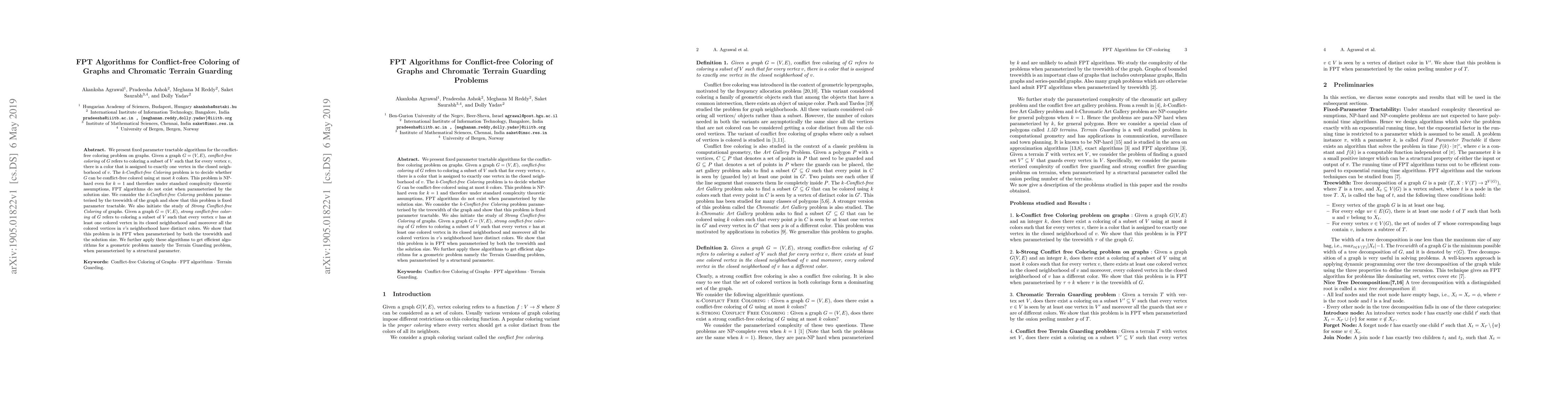 This paper presents fixed parameter tractable (FPT) algorithms for conflict-free coloring of graphs, showing that the k-Conflict-free Coloring problem is FPT when parameterized by the graph's treewidth. It also introduces strong conflict-free coloring and proves it is FPT when parameterized by both treewidth and solution size, applying these results to efficiently solve the Terrain Guarding problem.