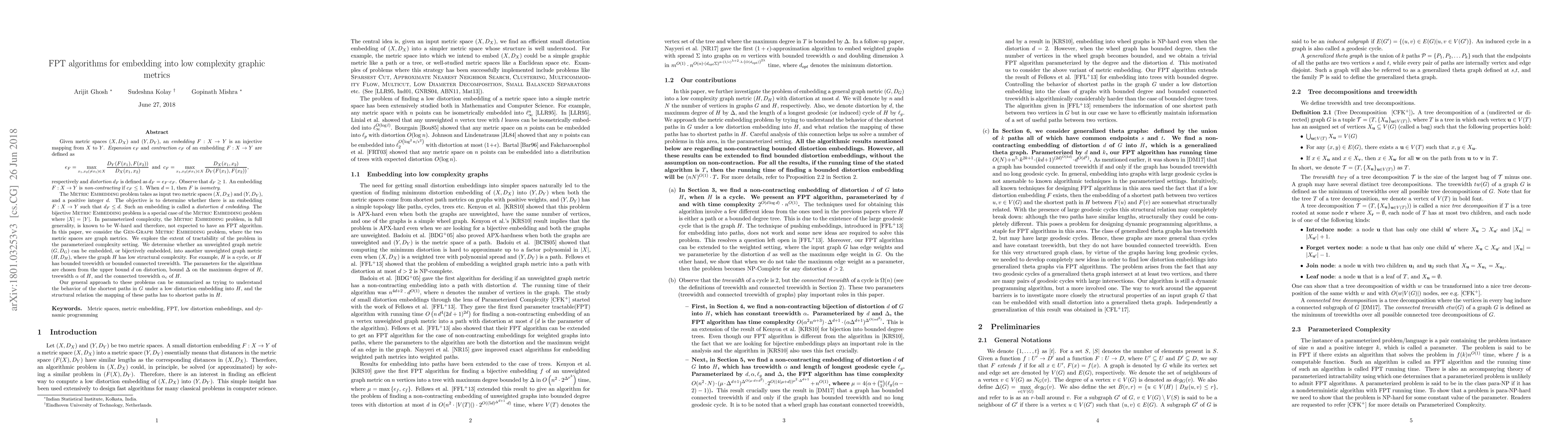The Metric Embedding problem takes as input two metric spaces $(X,D_X)$ and $(Y,D_Y)$, and a positive integer $d$. The objective is to determine whether there is an embedding $F:X \rightarrow Y$ such that $d_{F} \leq d$, where $d_{F}$ denotes the distortion of the map $F$. Such an embedding is called a distortion $d$ embedding. The bijective Metric Embedding problem is a special case of the Metric Embedding problem where $|X| = |Y|$. In parameterized complexity, the Metric Embedding problem, in full generality, is known to be W-hard and therefore, not expected to have an FPT algorithm. In this paper, we consider the Gen-Graph Metric Embedding problem, where the two metric spaces are graph metrics. We explore the extent of tractability of the problem in the parameterized complexity setting. We determine whether an unweighted graph metric $(G,D_G)$ can be embedded, or bijectively embedded, into another unweighted graph metric $(H,D_H)$, where the graph $H$ has low structural complexity. For example, $H$ is a cycle, or $H$ has bounded treewidth or bounded connected treewidth. The parameters for the algorithms are chosen from the upper bound $d$ on distortion, bound $\Delta$ on the maximum degree of $H$, treewidth $\alpha$ of $H$, and the connected treewidth $\alpha_{c}$ of $H$. Our general approach to these problems can be summarized as trying to understand the behavior of the shortest paths in $G$ under a low distortion embedding into $H$, and the structural relation the mapping of these paths has to shortest paths in $H$.
