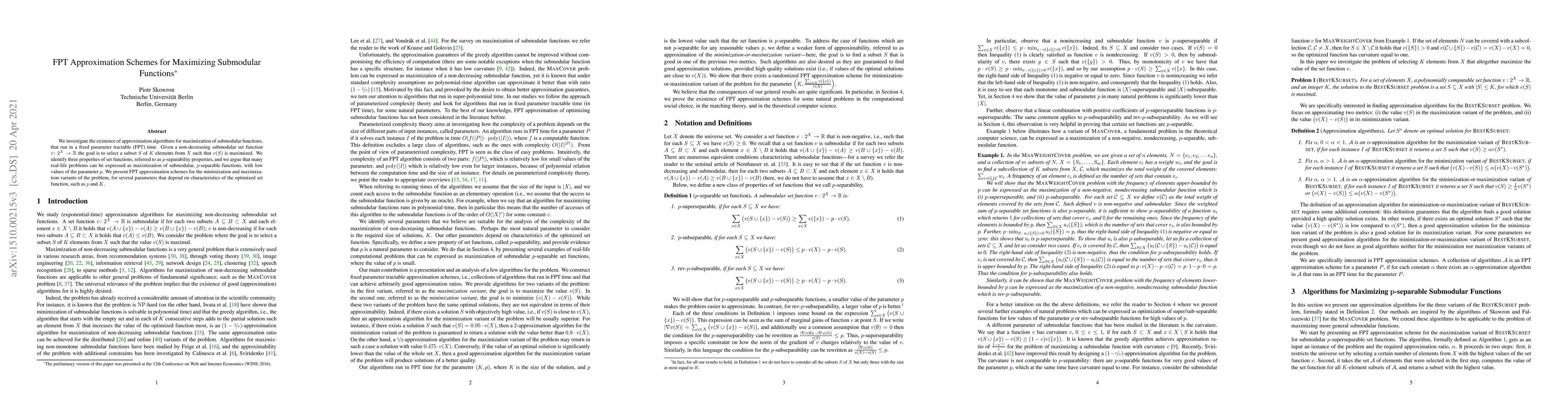 This research identifies three properties of set functions called $p$-separability properties, crucial for designing FPT approximation schemes to maximize submodular functions in fixed parameter tractable time. These algorithms apply to various real-life problems, including those in computational social choice like item selection or winner determination under multiple election systems.