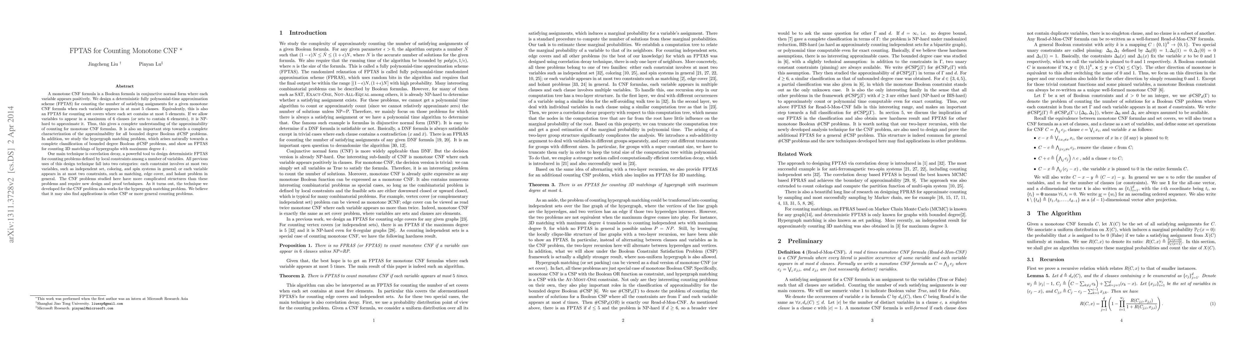 This paper presents a deterministic fully polynomial-time approximation scheme (FPTAS) for counting satisfying assignments of monotone CNF formulas where each variable appears in at most 5 clauses, leveraging a novel correlation decay technique. The authors also extend this method to achieve an FPTAS for counting 3D matchings in hypergraphs with maximum degree 4, marking significant progress in understanding the approximability of bounded degree Boolean #CSP problems.