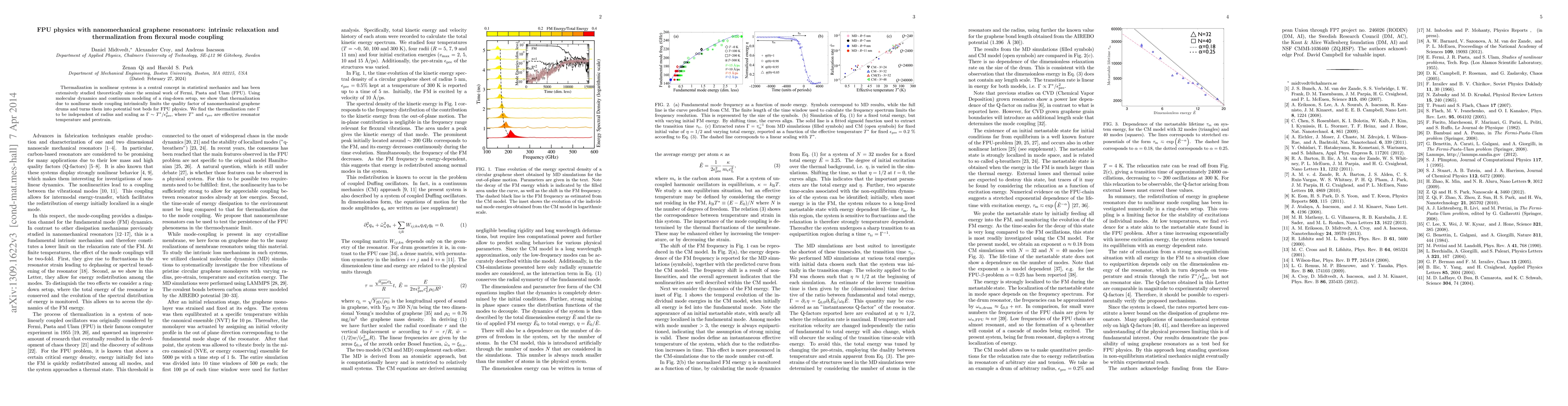 Thermalization in nonlinear systems is a central concept in statistical mechanics and has been extensively studied theoretically since the seminal work of Fermi, Pasta and Ulam (FPU). Using molecular dynamics and continuum modeling of a ring-down setup, we show that thermalization due to nonlinear mode coupling intrinsically limits the quality factor of nanomechanical graphene drums and turns them into potential test beds for FPU physics. We find the thermalization rate $\Gamma$ to be independent of radius and scaling as $\Gamma\sim T^*/\epsilon_{{\rm pre}}^2$, where $T^*$ and $\epsilon_{{\rm pre}}$ are effective resonator temperature and prestrain.
