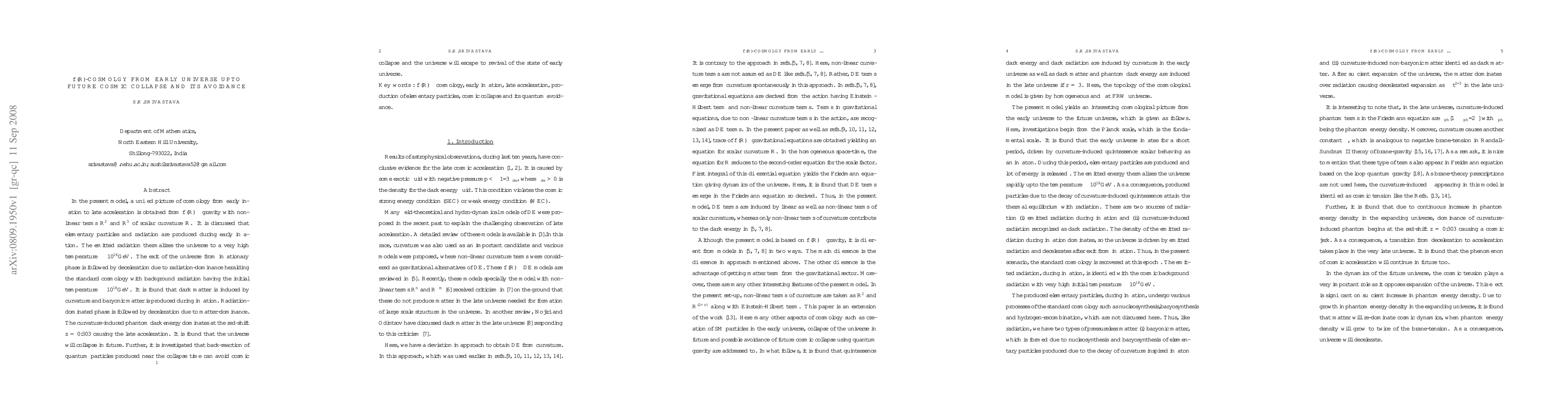 In the present model, a unified picture of cosmology from early inflation to late acceleration is obtained from $ f(R)-$ gravity with non-linear terms $ R^2 $ and $ R^5 $ of scalar curvature $R$. It is discussed that elementary particles and radiation are produced during early inflation. The emitted radiation thermalizes the universe to a very high temperature $ \sim 10^{18}{\rm GeV}$. The exit of the universe from inflationary phase is followed by deceleration due to radiation-dominance heralding the standard cosmology with background radiation having the initial temperature $ \sim 10^{18}{\rm GeV}$. It is found that dark matter is induced by curvature and baryonic matter is produced during inflation. Radiation-dominated phase is followed by deceleration due to matter-dominance. The curvature-induced phantom dark energy dominates at the red-shift $ z = 0.303 $ causing the late acceleration. It is found that the universe will collapse in future. Further, it is investigated that back-reaction of quantum particles produced near the collapse time can avoid cosmic collapse and the universe will escape to revival of the state of early universe.