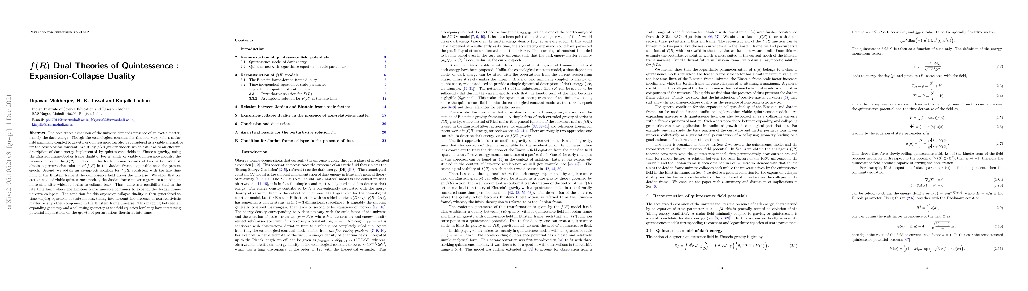 This paper explores $f(R)$ gravity models that describe dark energy through quintessence fields, utilizing the duality between Einstein and Jordan frames. It reveals an expansion-collapse duality in certain viable quintessence models, where the Jordan frame universe collapses while the Einstein frame continues expanding, with implications for late-time perturbation growth.
