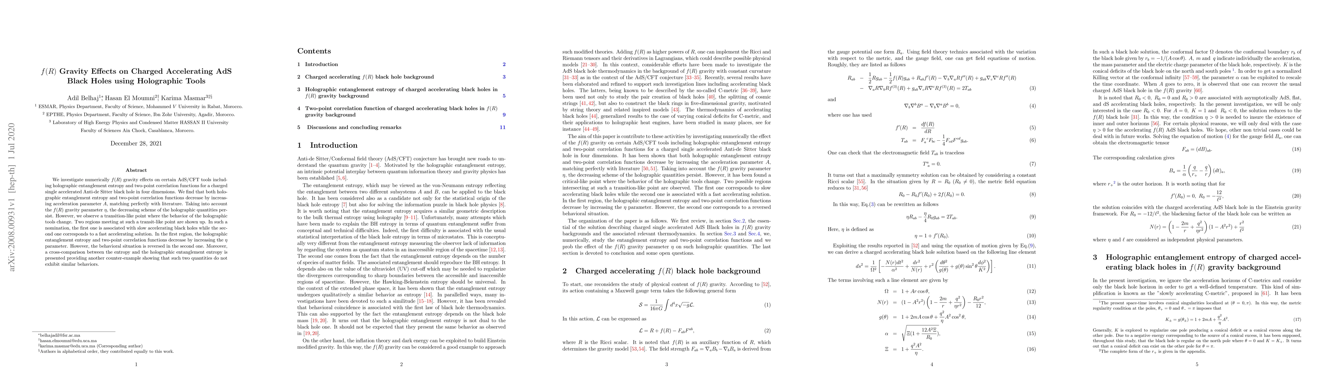We investigate numerically $f(R)$ gravity effects on certain AdS/CFT tools including holographic entanglement entropy and two-point correlation functions for a charged single accelerated Anti-de Sitter black hole in four dimensions. We find that both holographic entanglement entropy and two-point correlation functions decrease by increasing acceleration parameter $A$, matching perfectly with literature. Taking into account the $f(R)$ gravity parameter $\eta$, the decreasing scheme of the holographic quantities persist. However, we observe a transition-like point where the behavior of the holographic tools change. Two regions meeting at such a transit-like point are shown up. In such a nomination, the first one is associated with slow accelerating black holes while the second one corresponds to a fast accelerating solution. In the first region, the holographic entanglement entropy and two-point correlation functions decrease by increasing the $\eta$ parameter. However, the behavioral situation is reversed in the second one. Moreover, a cross-comparison between the entropy and the holographic entanglement entropy is presented providing another counter-example showing that such two quantities do not exhibit similar behaviors.
