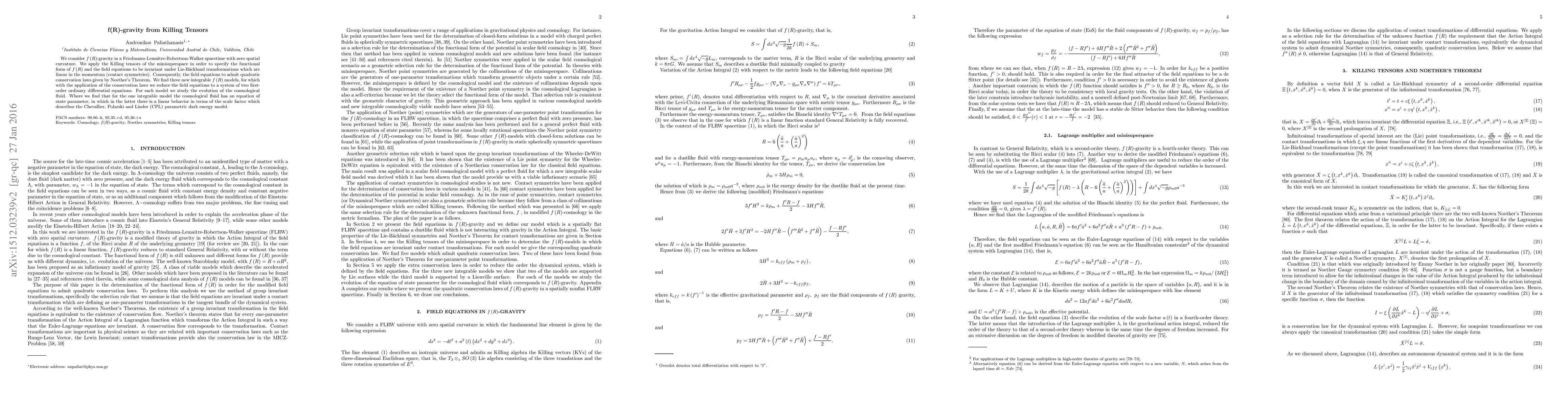 This paper explores $f(R)$-gravity in a flat Friedmann-Lemaître-Robertson-Walker spacetime, using Killing tensors to determine the functional form of $f(R)$ invariant under Lie-Bäcklund transformations. It identifies three new integrable $f(R)$ models, reducing the field equations to two first-order ODEs and revealing a linear equation of state for the cosmological fluid akin to the CPL dark energy model.