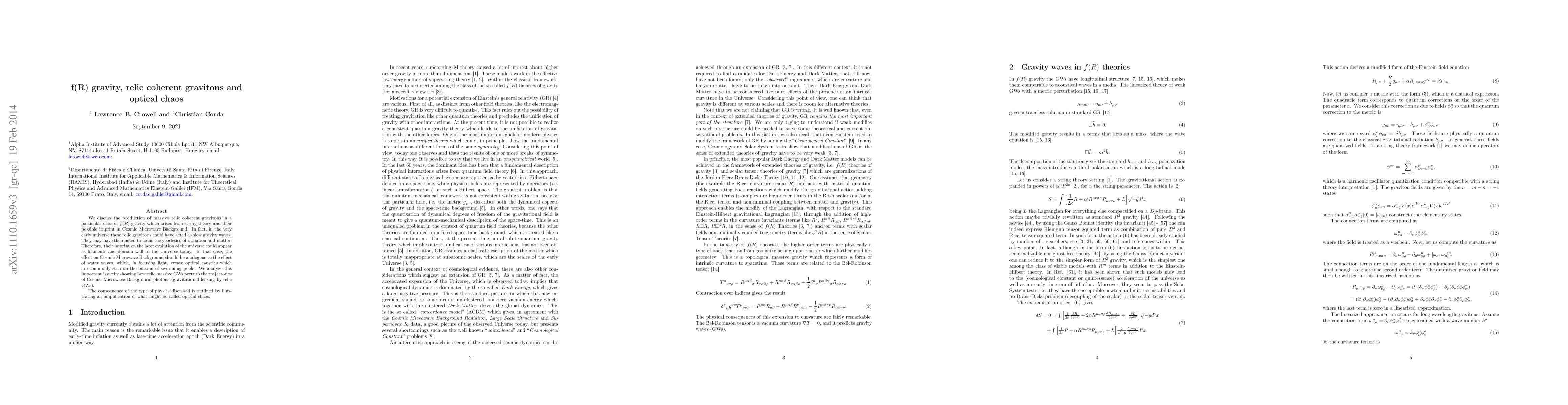 This paper explores the production of massive relic coherent gravitons in f(R) gravity, potentially influencing the Cosmic Microwave Background (CMB) through gravitational lensing. It suggests these relic gravitons could create optical chaos effects analogous to water waves focusing light, impacting the universe's structure today.