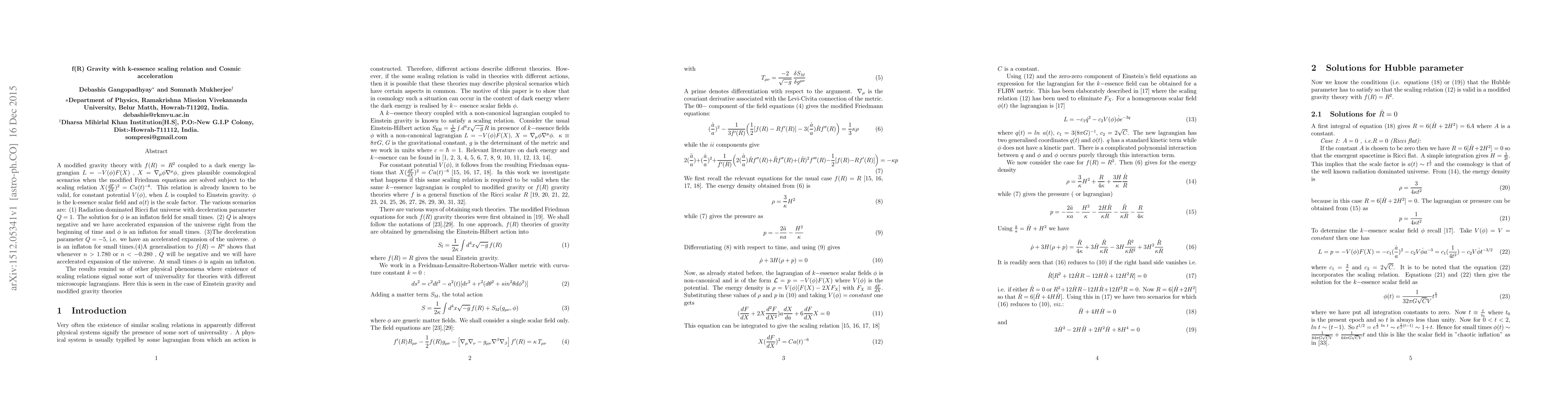 A modified gravity theory with $f(R)=R^2$ coupled to a dark energy lagrangian $L=-V(\phi)F(X)$ , $X=\nabla_{\mu}\phi\nabla^{\mu}\phi$, gives plausible cosmological scenarios when the modified Friedman equations are solved subject to the scaling relation $X (\frac{dF}{dX})^{2}=Ca(t)^{-6}$. This relation is already known to be valid, for constant potential $V(\phi)$, when $L$ is coupled to Einstein gravity. $\phi$ is the k-essence scalar field and $a(t)$ is the scale factor. The various scenarios are: (1) Radiation dominated Ricci flat universe with deceleration parameter $Q=1$. The solution for $\phi$ is an inflaton field for small times. (2) $Q$ is always negative and we have accelerated expansion of the universe right from the beginning of time and $\phi$ is an inflaton for small times. (3)The deceleration parameter $Q= -5$, i.e. we have an accelerated expansion of the universe. $\phi$ is an inflaton for small times.(4)A generalisation to $f(R)= R^n$ shows that whenever $n > 1.780$ or $n < - 0.280$ , $Q$ will be negative and we will have accelerated expansion of the universe. At small times $\phi$ is again an inflaton.