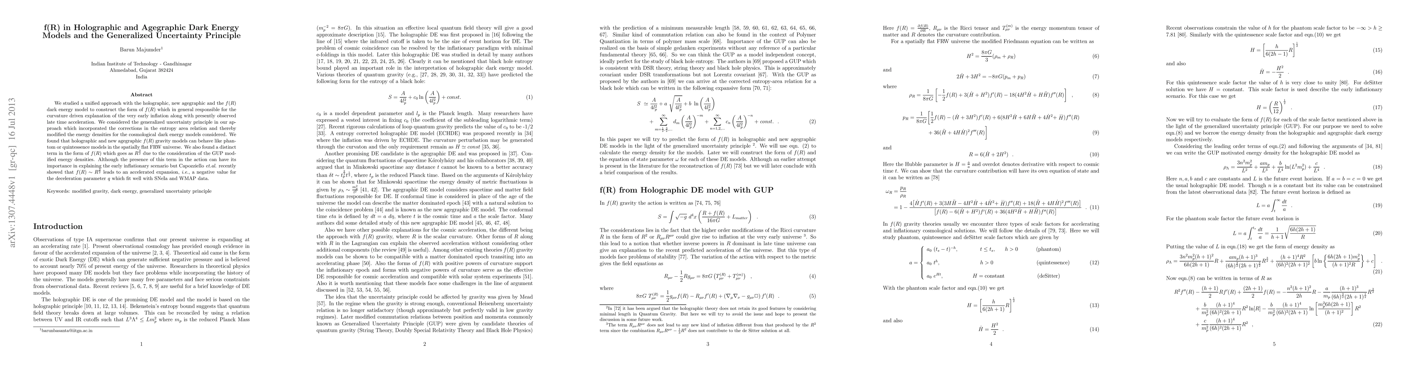 We studied a unified approach with the holographic, new agegraphic and the $f(R)$ dark energy model to construct the form of $f(R)$ which in general responsible for the curvature driven explanation of the very early inflation along with presently observed late time acceleration. We considered the generalized uncertainty principle in our approach which incorporated the corrections in the entropy area relation and thereby modified the energy densities for the cosmological dark energy models considered. We found that holographic and new agegraphic $f(R)$ gravity models can behave like phantom or quintessence models in the spatially flat FRW universe. We also found a distinct term in the form of $f(R)$ which goes as $R^{\frac{3}{2}}$ due to the consideration of the GUP modified energy densities. Although the presence of this term in the action can have its importance in explaining the early inflationary scenario but Capozziello {\it et.al.} recently showed that $f(R) \sim R^{\frac{3}{2}}$ leads to an accelerated expansion, {\it i.e.}, a negative value for the deceleration parameter $q$ which fit well with SNeIa and WMAP data.
