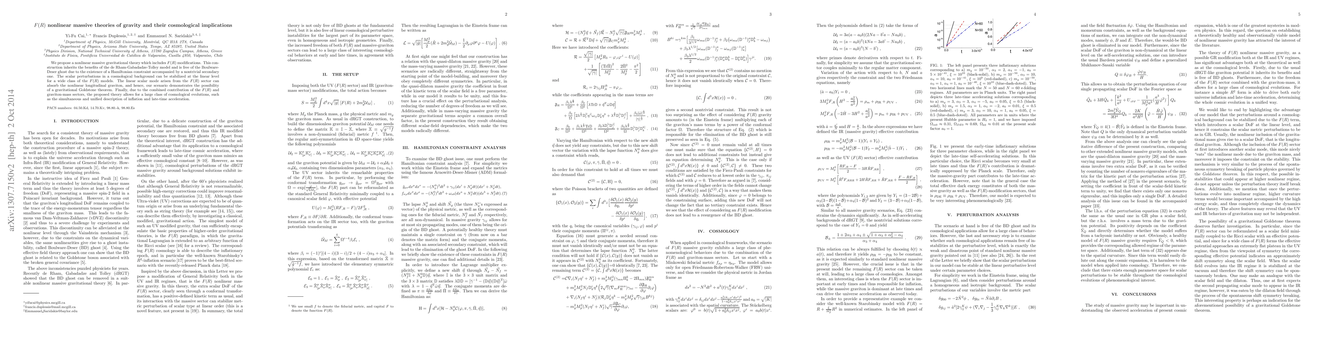 This paper proposes a nonlinear massive gravitational theory incorporating $F(R)$ modifications, which avoids the Boulware-Deser ghost and stabilizes scalar perturbations in cosmological backgrounds. The theory allows for diverse cosmological evolutions, including inflation and late-time acceleration.