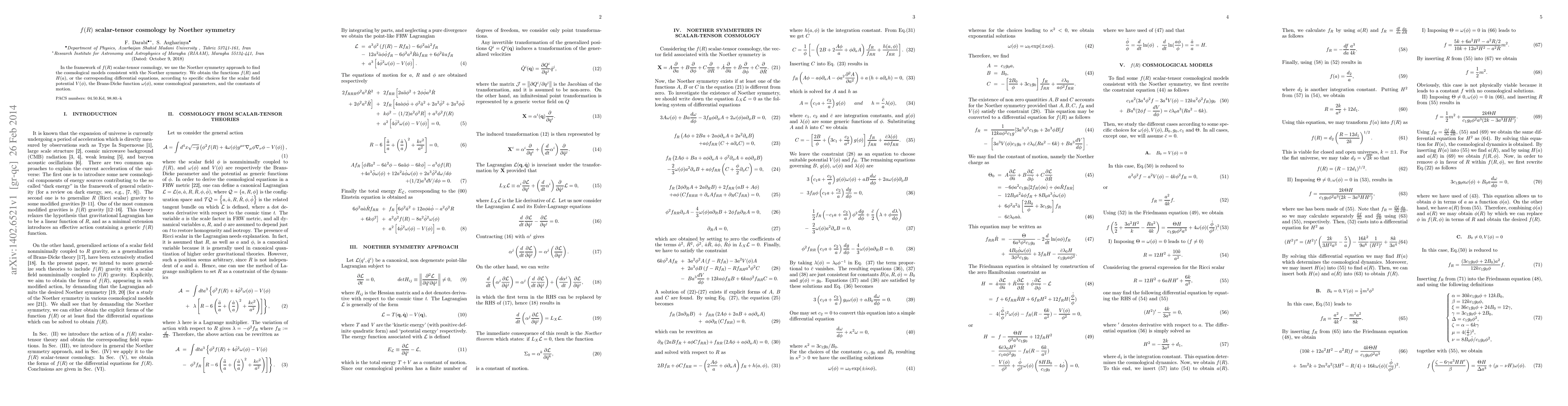 This paper explores f(R) scalar-tensor cosmology using the Noether symmetry approach to derive consistent cosmological models. It determines functions f(R) and H(a) based on choices for scalar field potential V(ϕ), Brans-Dicke function ω(ϕ), cosmological parameters, and constants of motion.