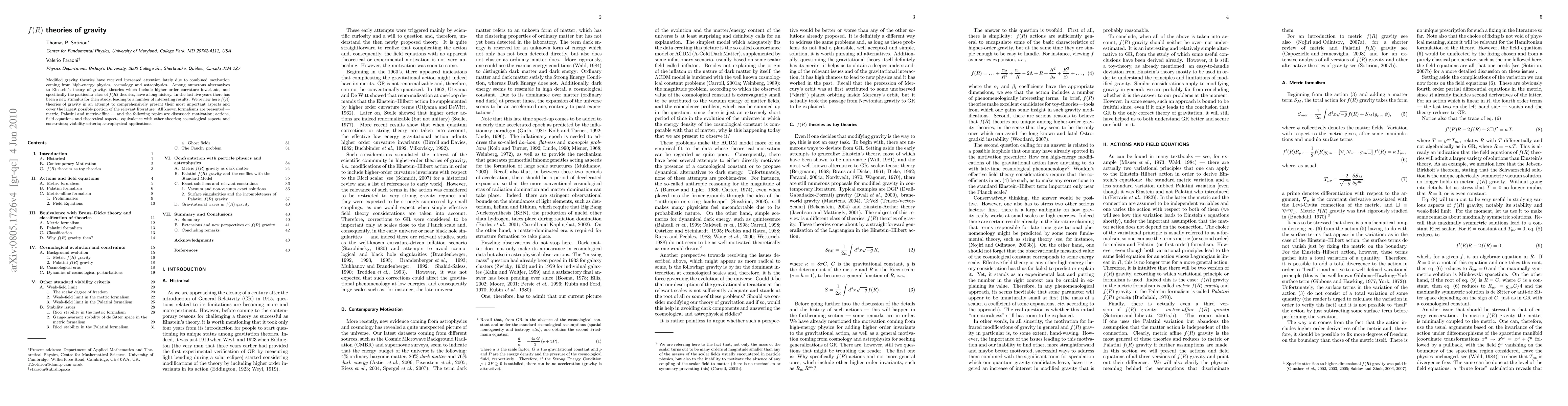 Modified gravity theories have received increased attention lately due to combined motivation coming from high-energy physics, cosmology and astrophysics. Among numerous alternatives to Einstein's theory of gravity, theories which include higher order curvature invariants, and specifically the particular class of f(R) theories, have a long history. In the last five years there has been a new stimulus for their study, leading to a number of interesting results. We review here f(R) theories of gravity in an attempt to comprehensively present their most important aspects and cover the largest possible portion of the relevant literature. All known formalisms are presented -- metric, Palatini and metric-affine -- and the following topics are discussed: motivation; actions, field equations and theoretical aspects; equivalence with other theories; cosmological aspects and constraints; viability criteria; astrophysical applications.