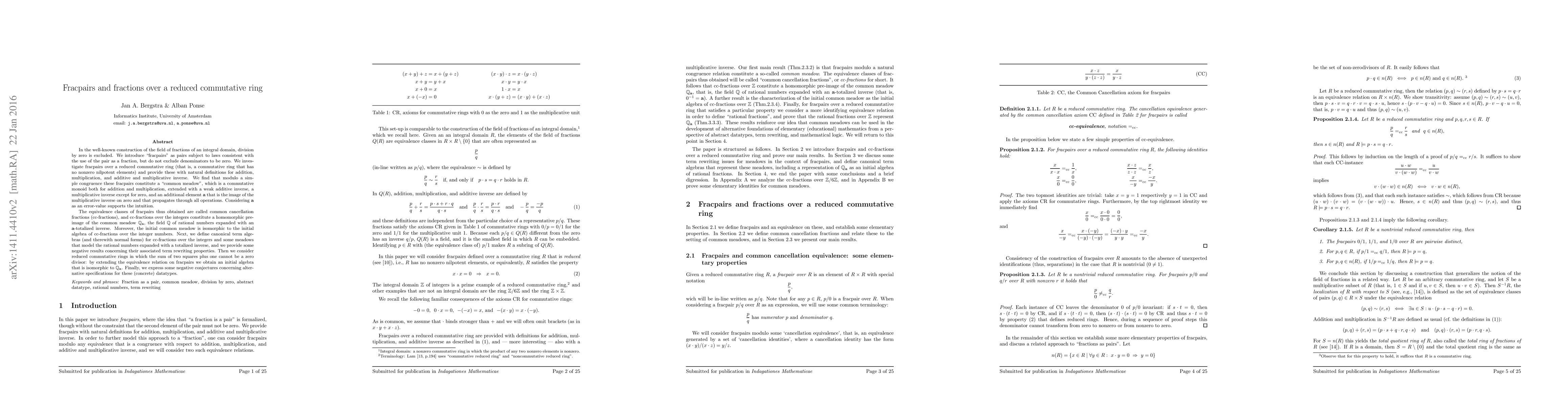 In the well-known construction of the field of fractions of an integral domain, division by zero is excluded. We introduce "fracpairs" as pairs subject to laws consistent with the use of the pair as a fraction, but do not exclude denominators to be zero. We investigate fracpairs over a reduced commutative ring (a commutative ring that has no nonzero nilpotent elements) and provide these with natural definitions for addition, multiplication, and additive and multiplicative inverse. We find that modulo a simple congruence these fracpairs constitute a "common meadow", which is a commutative monoid both for addition and multiplication, extended with a weak additive inverse, a multiplicative inverse except for zero, and an additional element "a" that is the image of the multiplicative inverse on zero and that propagates through all operations. Considering "a" as an error-value supports the intuition. The equivalence classes of fracpairs thus obtained are called common cancellation fractions (cc-fractions), and cc-fractions over the integers constitute a homomorphic pre-image of the common meadow Qa, the field Q of rational numbers expanded with an a-totalized inverse. Moreover, the initial common meadow is isomorphic to the initial algebra of cc-fractions over the integer numbers. Next, we define canonical term algebras for cc-fractions over the integers and some meadows that model the rational numbers expanded with a totalized inverse, and provide some negative results concerning their associated term rewriting properties. Then we consider reduced commutative rings in which the sum of two squares plus one cannot be a zero divisor: by extending the equivalence relation on fracpairs we obtain an initial algebra that is isomorphic to Qa. Finally, we express negative conjectures concerning alternative specifications for these (concrete) datatypes.
