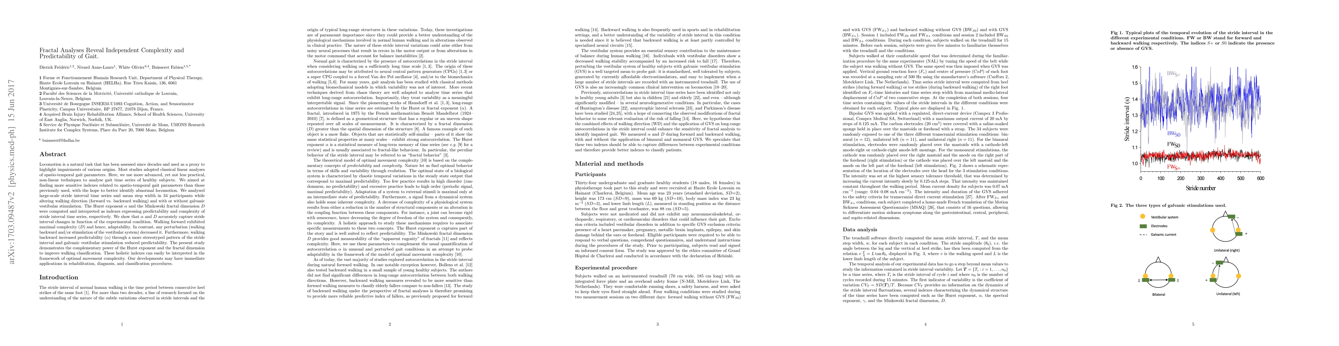 A study used fractal analysis to better understand walking patterns in healthy subjects, finding that forward walking is more complex and adaptable, while backward walking and vestibular stimulation decrease complexity and increase predictability.